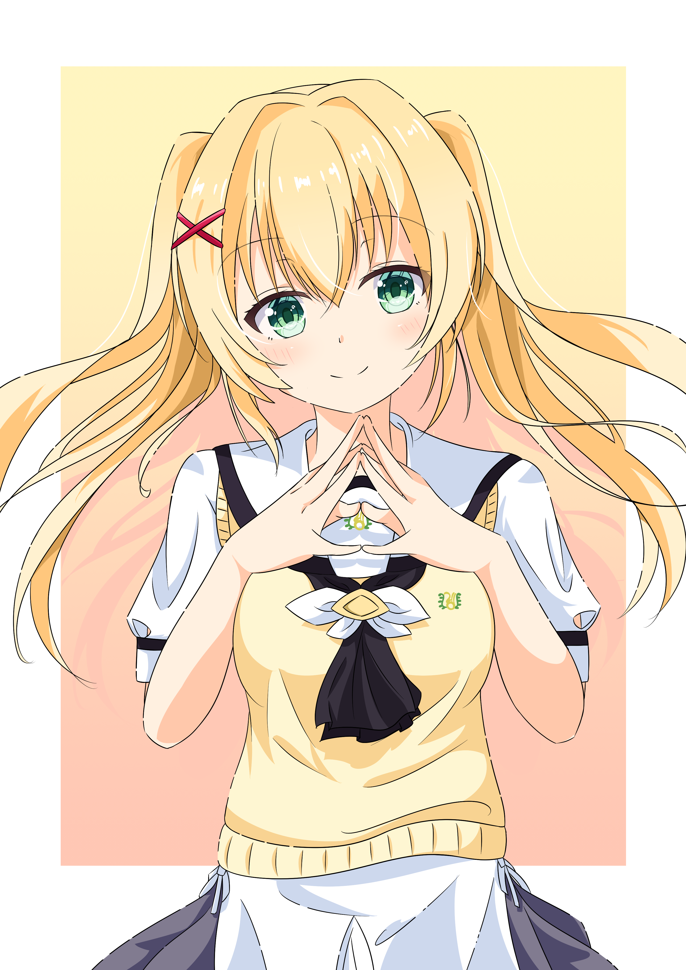 1girl absurdres ascot black_ascot blonde_hair blush border closed_mouth commentary cowboy_shot eyelashes floating_hair gradient_background green_eyes hair_between_eyes hair_intakes hair_ornament hands_up highres kyamiuu long_hair looking_at_viewer pink_background puffy_short_sleeves puffy_sleeves sailor_collar school_uniform shirt short_sleeves sidelocks simple_background skirt smile solo split_mouth steepled_fingers straight-on summer_pockets sweater_vest tsumugi_wenders twintails white_border white_sailor_collar white_shirt white_skirt x_hair_ornament yellow_background yellow_sweater_vest