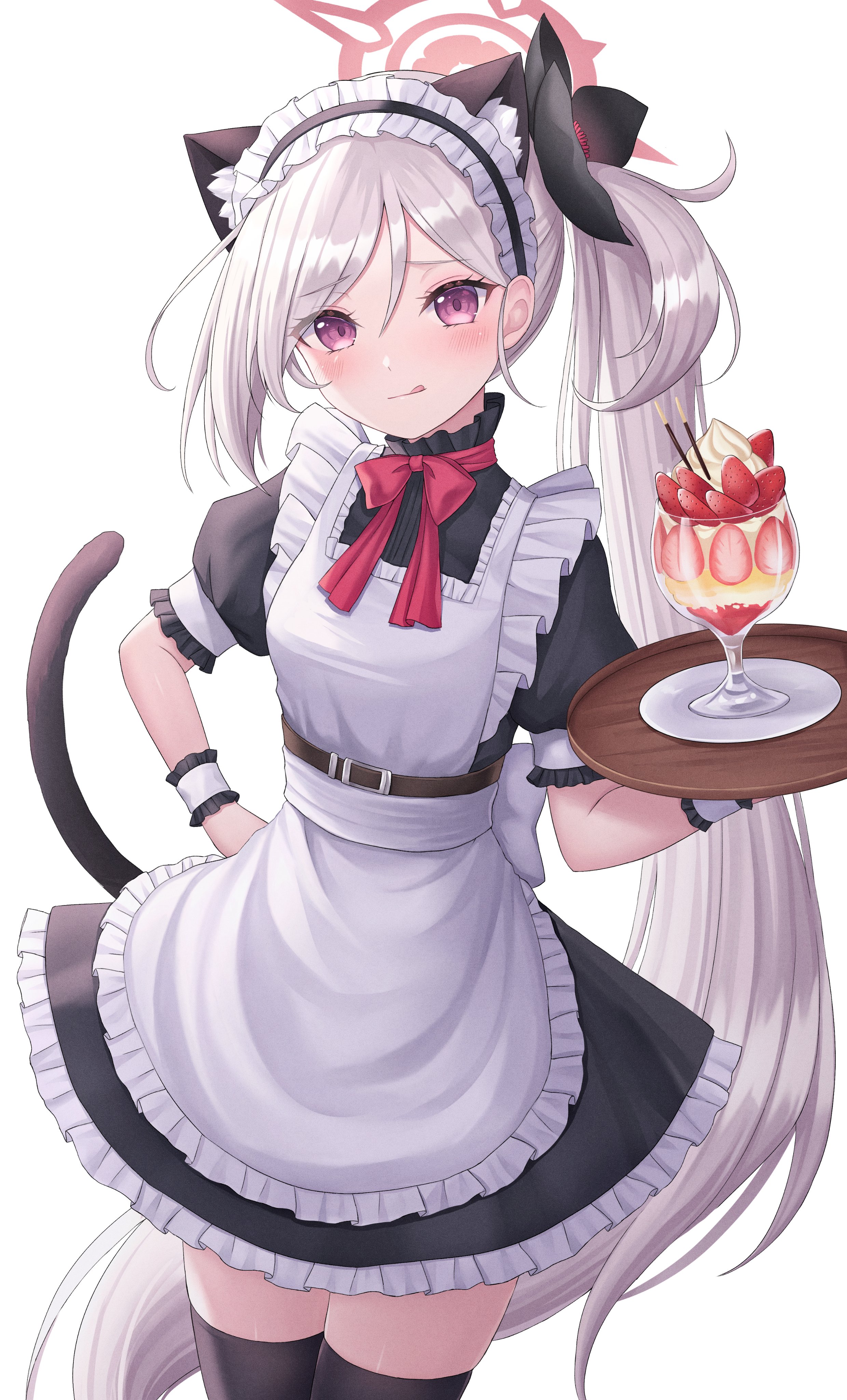 1girl :q absurdres alternate_costume animal_ears apron black_flower blue_archive cake cat_ears cat_tail enmaided fake_animal_ears fake_tail flower food fruit grey_hair halo highres holding long_hair looking_at_viewer maid maid_apron maid_headdress mutsuki_(blue_archive) neck_ribbon purple_eyes red_halo red_ribbon ribbon seungju_lee side_ponytail simple_background solo strawberry tail thighhighs thighs tongue tongue_out very_long_hair white_apron white_background zettai_ryouiki