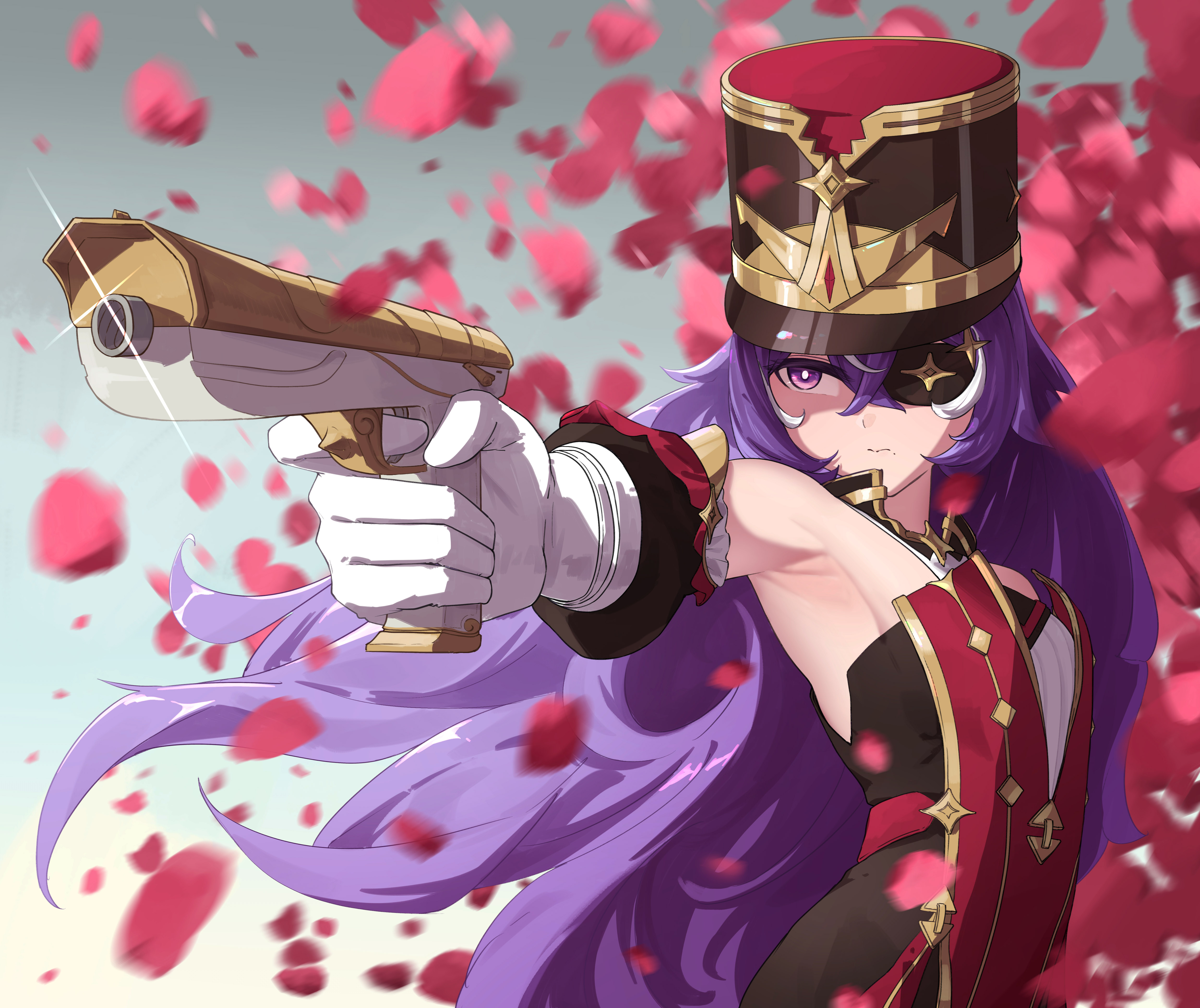 1girl absurdres armpits bare_shoulders black_dress black_hat bright_pupils chevreuse_(genshin_impact) commentary_request crossed_bangs detached_sleeves dress eyepatch genshin_impact gloves gold_trim gun hair_between_eyes handgun hat highres holding holding_gun holding_weapon long_hair mole mole_under_mouth multicolored_hair petals puffy_detached_sleeves puffy_sleeves purple_eyes purple_hair red_dress shako_cap sidelocks solo strapless strapless_dress streaked_hair two-tone_dress two-tone_hair upper_body very_long_hair weapon white_gloves white_hair white_pupils yinhe_yan