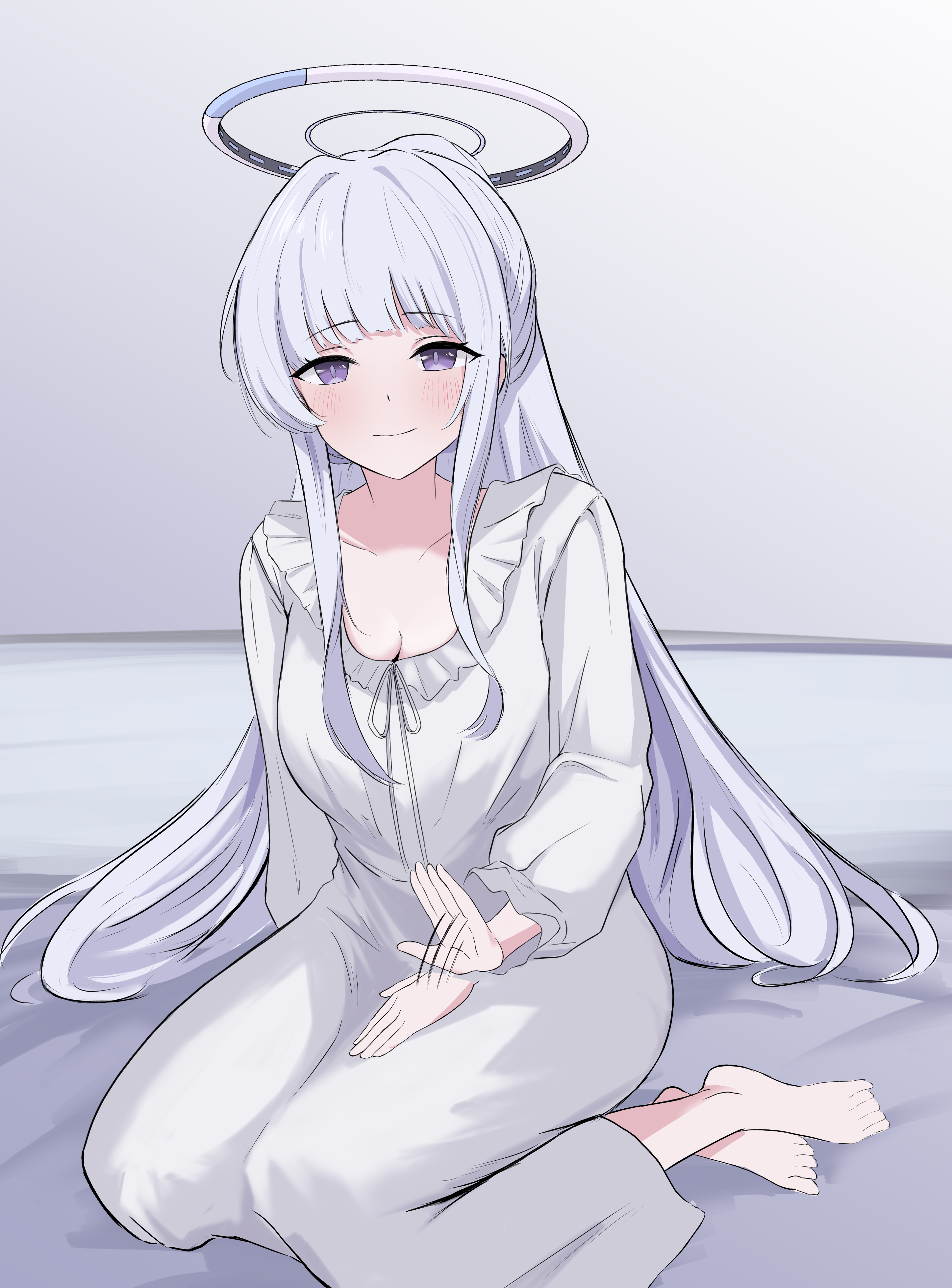 1girl 4jiri absurdres barefoot blue_archive blunt_bangs halo hand_on_own_thigh highres lap_pillow_invitation long_hair looking_at_viewer loungewear mechanical_halo noa_(blue_archive) noa_(pajamas)_(blue_archive) official_alternate_costume pajamas purple_eyes seiza sitting smile white_hair white_halo