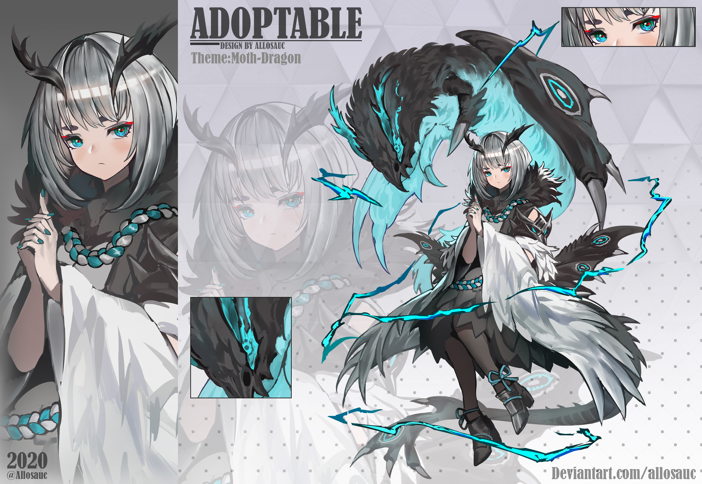1girl 2020 adoptable allosauc aqua_belt aqua_eyes aqua_nails aqua_ribbon artist_name bare_shoulders belt black_footwear black_horns black_kimono black_wings boots reference_sheet close-up closed_mouth commentary cowboy_shot detached_sleeves deviantart_username dragon dragon_horns dragon_tail dragon_wings english_commentary english_text eyelashes eyeliner eyeshadow feather_sleeves footwear_ribbon full_body gradient_background grey_background grey_eyeshadow grey_pantyhose high_heel_boots high_heels highres horns interlocked_fingers japanese_clothes kimono light_blush light_frown looking_at_viewer makeup mini_wings multiple_views nail_polish original own_hands_clasped own_hands_together pantyhose polka_dot polka_dot_background projected_inset red_eyeliner ribbon rope_belt rope_necklace short_hair_with_long_locks simple_background sleeveless sleeveless_kimono tail triangle_background turtleneck two-tone_belt white_belt white_hair white_sleeves wide_sleeves wings