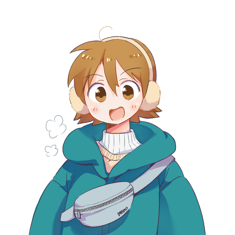 1girl aioi_yuuko artist_name blue_hoodie blush brown_eyes brown_hair earmuffs fanny_pack hair_between_eyes hood hoodie nichijou open_mouth orange_sweater puff_of_air short_hair simple_background smile solo sun_visor_(mata69) sweater white_background white_sweater