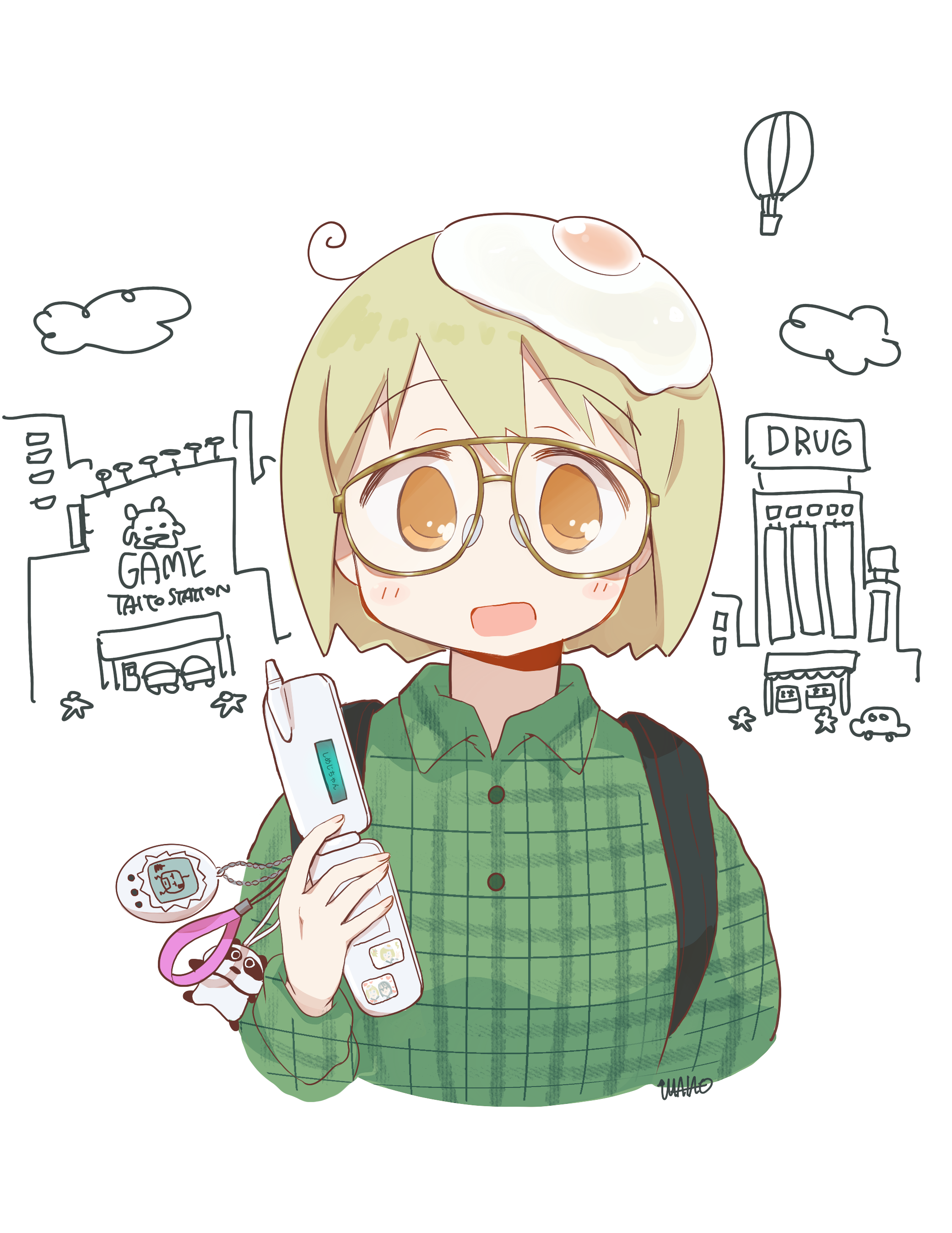1girl absurdres aircraft animal_charm artist_name backpack bag black_bag blonde_hair blush car cellphone charm_(object) city cityscape cloud egg egg_(food) egg_yolk flip_phone food food_on_head fried_egg glasses green_shirt hair_between_eyes highres holding holding_phone hot_air_balloon looking_at_viewer motor_vehicle object_on_head open_mouth orange_eyes people phone plaid_clothes plaid_shirt shimeji_simulation shirt short_hair simple_background smile solo sun_visor_(mata69) tamagotchi tamagotchi_(classic) tamagotchi_(virtual_pet) upper_body virtual_pet_(toy) white_background yamashita_majime yellow-framed_eyewear