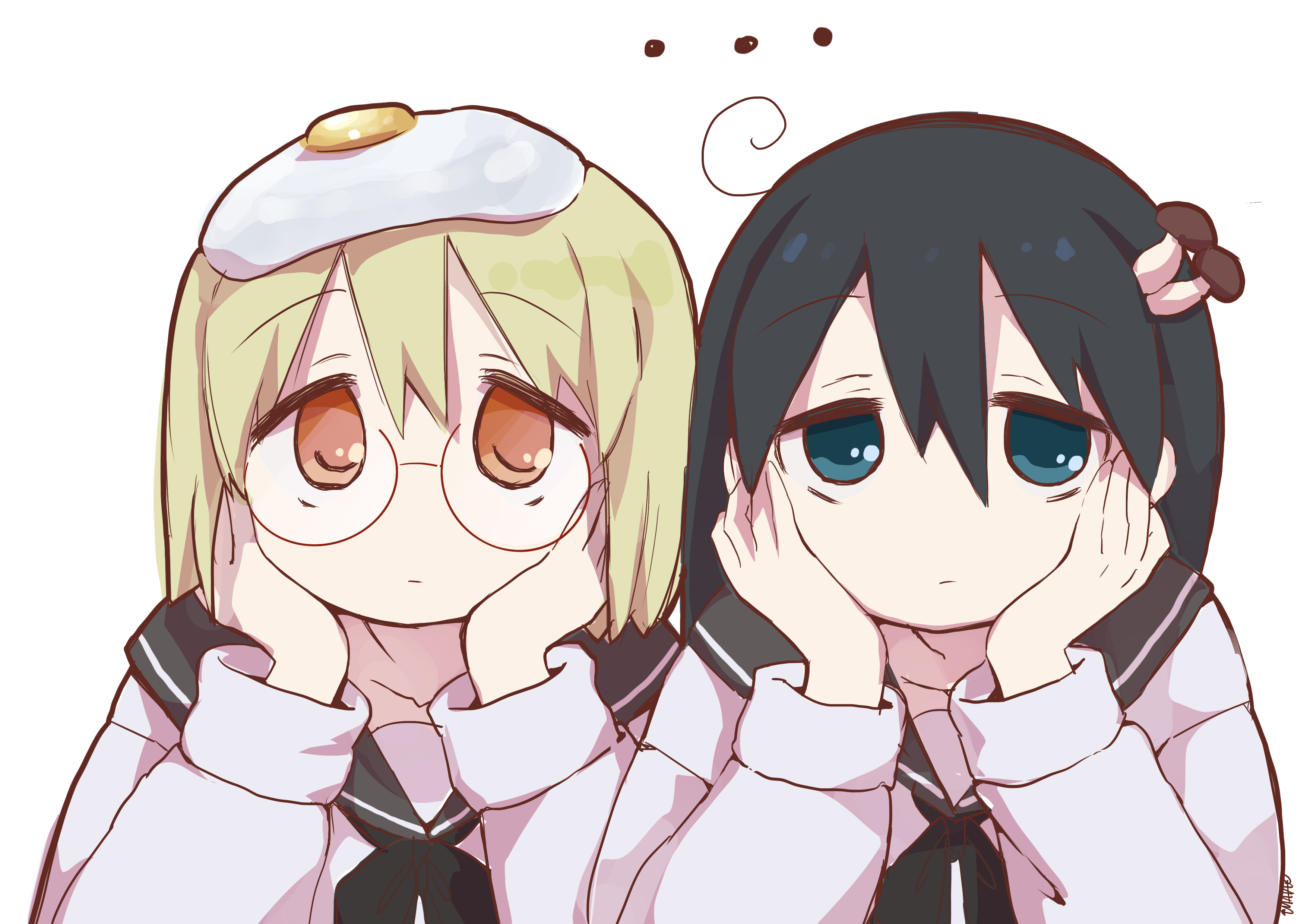 ... 2girls absurdres artist_name black_hair blonde_hair blue_eyes closed_mouth egg egg_(food) egg_yolk food food_on_head fried_egg glasses hair_between_eyes hands_on_own_cheeks hands_on_own_face highres long_hair multiple_girls mushroom mushroom_on_head object_on_head orange_eyes red-framed_eyewear school_uniform semi-rimless_eyewear serafuku shimeji_simulation short_hair simple_background sun_visor_(mata69) tsukishima_shijima white_background yamashita_majime