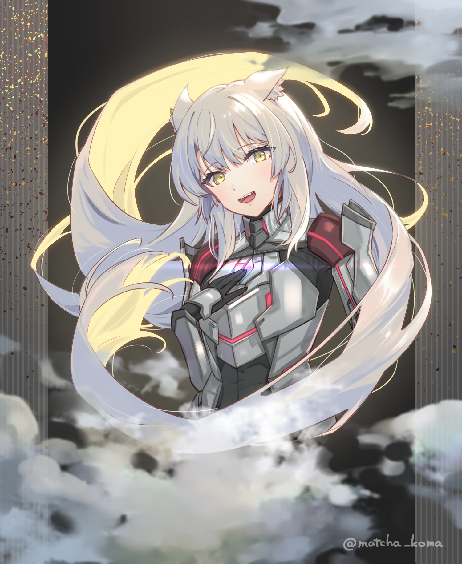 1girl animal_ears armor black_gloves cat_ears chest_jewel fang fog gloves grey_hair hand_on_own_chest highres long_hair m_(xenoblade) twitter_username xenoblade_chronicles_(series) xenoblade_chronicles_3 yanagimachi yellow_eyes