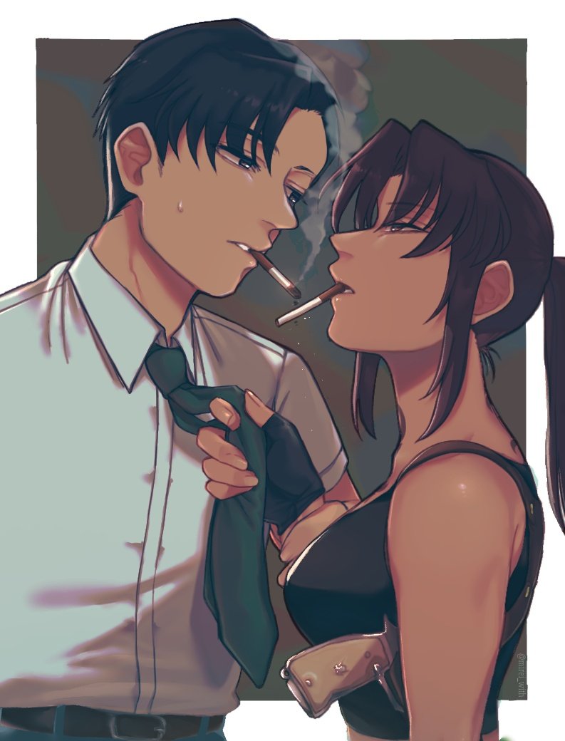 1boy 1girl black_hair black_lagoon black_shirt blue_pants border breasts brown_eyes brown_hair cigarette clothes_grab green_necktie height_difference looking_at_another mirei_(with) necktie necktie_grab neckwear_grab okajima_rokuro pants revy_(black_lagoon) shirt sleeveless sleeveless_shirt smoking white_border white_shirt