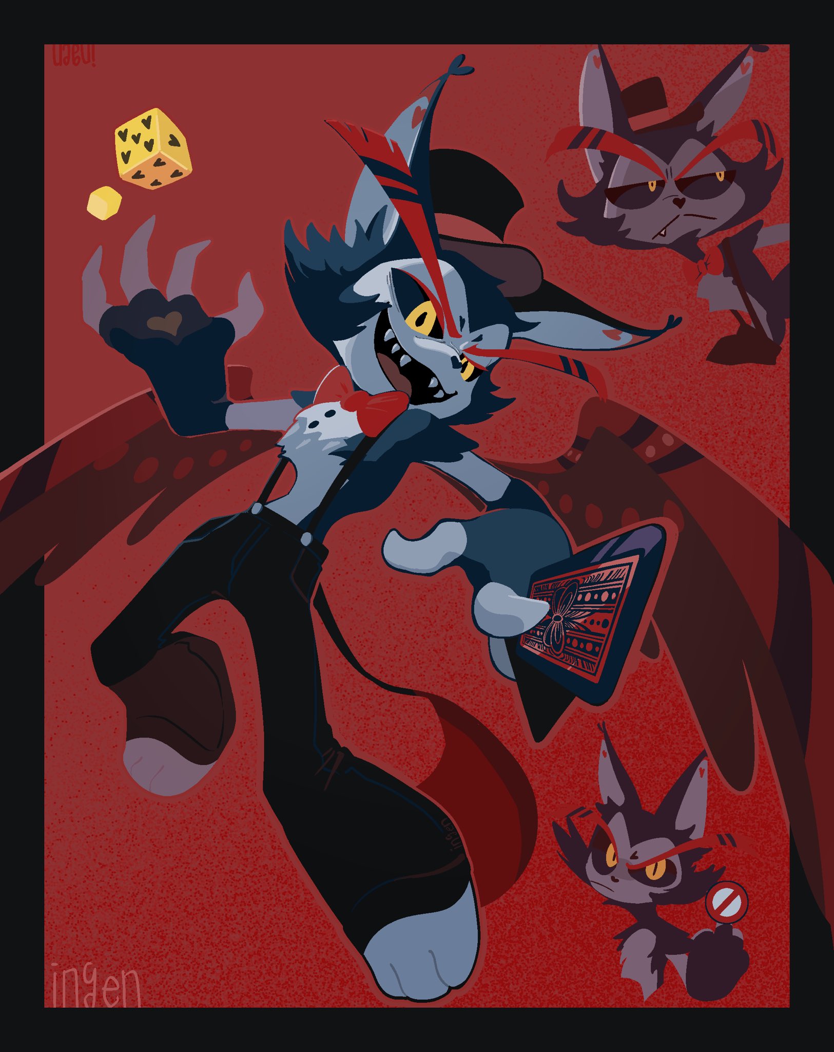 1boy :< animal_ears animal_nose artist_name between_fingers black_border black_fur black_headwear black_pants black_sclera body_fur border bow bowtie card card_between_fingers cat_boy cat_ears censored censored_gesture claws colored_sclera dice frown full_body fur-tipped_tail furry furry_male gradient_background hand_up hat hazbin_hotel hellaverse highres holding holding_card husk_(hazbin_hotel) ingen_(ingen-godzzila) looking_at_viewer male_focus middle_finger multiple_views open_mouth outside_border pants peeking peeking_out playing_card red_background red_bow red_bowtie red_wings sharp_teeth simple_background smile suspenders tail teeth top_hat traditional_bowtie two-tone_fur v-shaped_eyebrows white_fur wings yellow_eyes