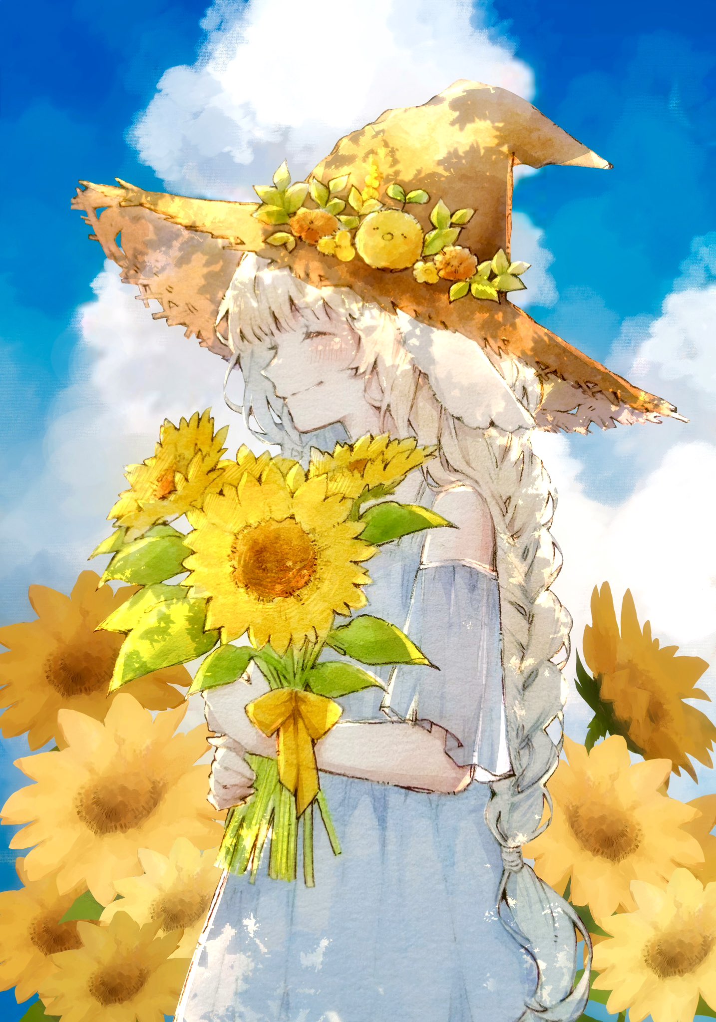 animal_ears anna_(k0130) baby_animal bare_shoulders bird bouquet bow braid chick closed_eyes closed_mouth cloud commentary dappled_sunlight day dress english_commentary facing_ahead floral_background flower from_side grey_dress hat hat_flower highres holding holding_bouquet holding_flower long_hair nature original profile short_sleeves single_braid sky smile sundress sunflower sunlight upper_body very_long_hair white_hair witch_hat yellow_bow yellow_flower yellow_theme