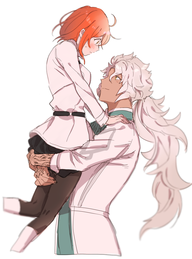 1boy 1girl ahoge arm_tattoo belt black_belt black_skirt blurry_edges blush chaldea_uniform closed_mouth coat cosplay cropped_legs dark-skinned_male dark_skin eye_contact fate/grand_order fate_(series) from_side fujimaru_ritsuka_(female) hand_tattoo hands_on_another's_shoulders hetero lifting_person long_hair long_sleeves looking_at_another orange_hair romani_archaman romani_archaman_(cosplay) shirt short_hair simple_background skirt smile solomon_(fate) tattoo wani_(mezo) wavy_hair white_background white_coat white_hair white_shirt yellow_eyes