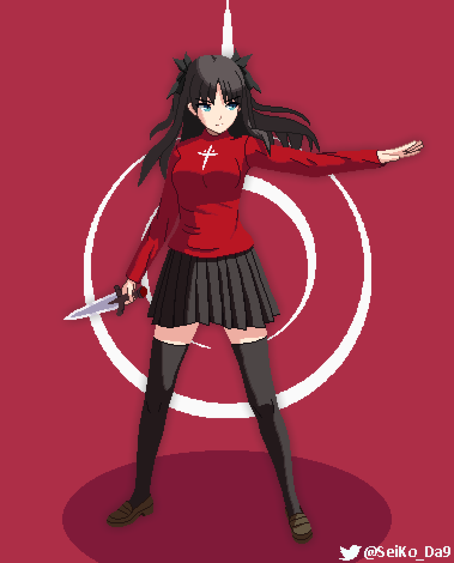 1girl black_hair black_skirt black_thighhighs blue_eyes bow breasts closed_mouth command_spell dagger fate/stay_night fate_(series) floating_hair full_body hair_bow highres holding holding_dagger holding_knife holding_weapon knife long_hair long_sleeves medium_breasts miniskirt outstretched_arms pixel_art pleated_skirt red_background red_shirt seiko093 shirt skirt solo standing thighhighs tohsaka_rin turtleneck twitter_username two_side_up weapon zettai_ryouiki