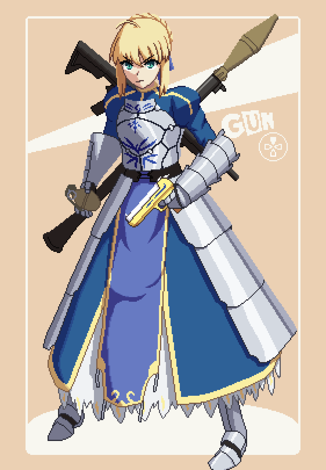 1girl armor armored_dress artoria_pendragon_(fate) blonde_hair braid braided_bun dress explosive fate/grand_order fate_(series) gauntlets green_eyes grenade gun gun_on_back hair_bun handgun highres knight pixel_art rocket_launcher seiko093 type-moon weapon weapon_on_back