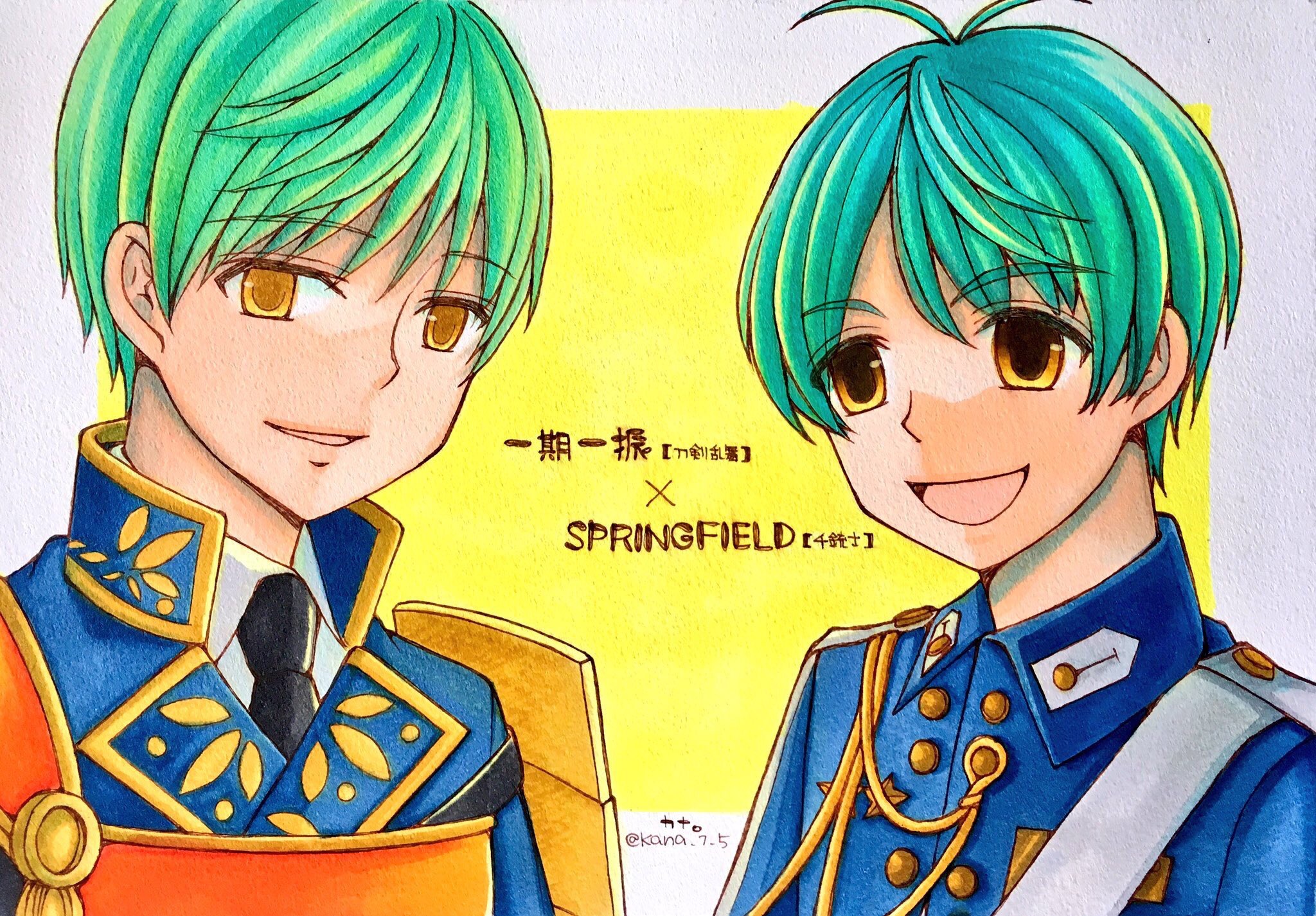 2boys green_hair highres ichigo_hitofuri look-alike male_focus multiple_boys senjuushi_(series) springfield_(senjuushi) touken_ranbu