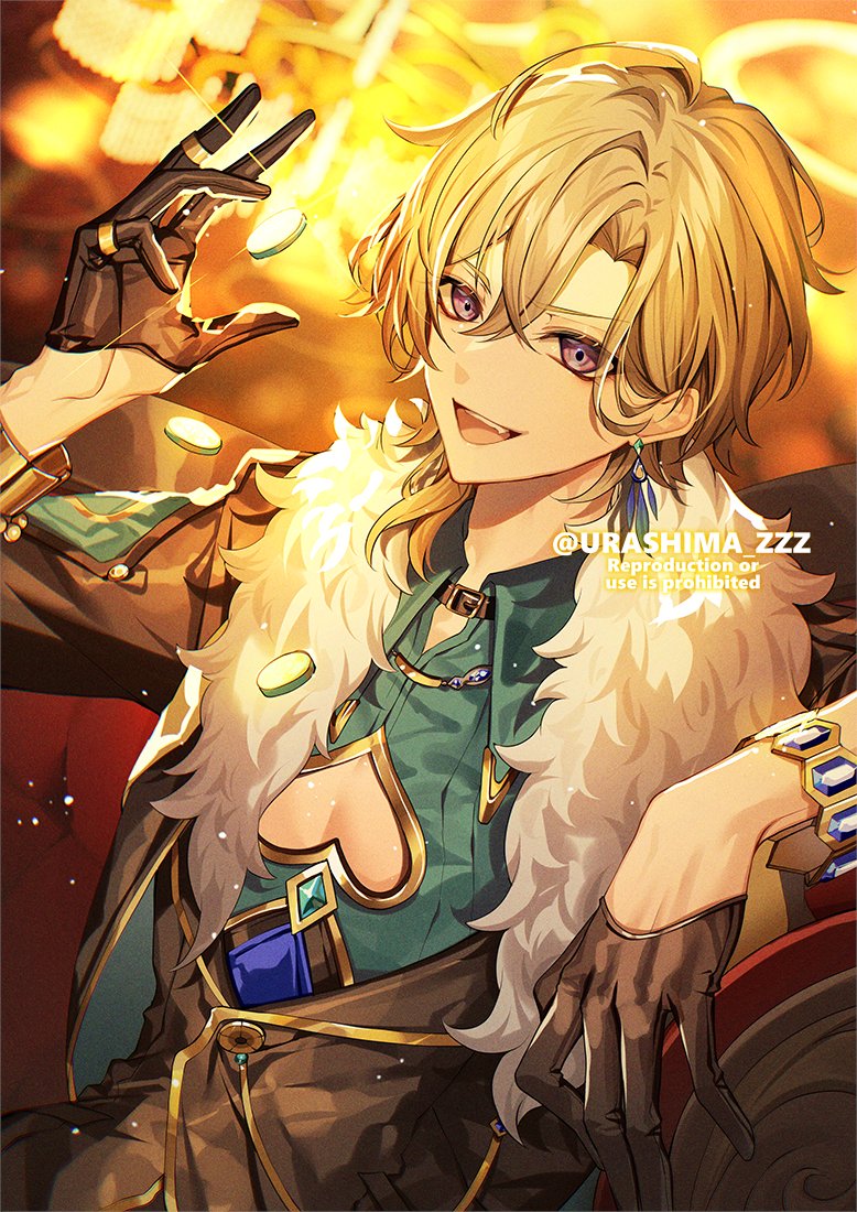 1boy aventurine_(honkai:_star_rail) black_gloves blonde_hair bracelet crossed_bangs english_text fur_trim gloves green_shirt hair_between_eyes honkai:_star_rail honkai_(series) jewelry male_focus open_mouth pectoral_cleavage pectorals poker_chip shirt short_hair sitting teeth twitter_username upper_teeth_only urashima_(hidoro_mgmg) v-shaped_eyebrows
