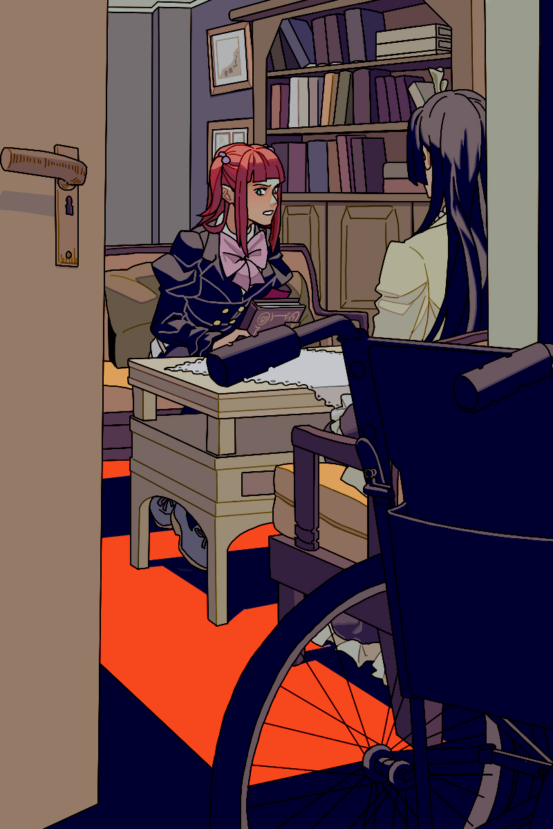 2girls armband armchair becomeafish black_hair blue_eyes blunt_bangs blunt_sidelocks book bookshelf bow buttons chair couch double-breasted dress hachijou_ikuko hair_bobbles hair_ornament highres hime_cut holding holding_book indoors jacket long_dress long_hair long_sleeves multiple_girls open_door open_mouth picture_frame pillow puffy_long_sleeves puffy_sleeves red_hair sidelocks sitting spoilers table two_side_up umineko_no_naku_koro_ni ushiromiya_ange wheelchair
