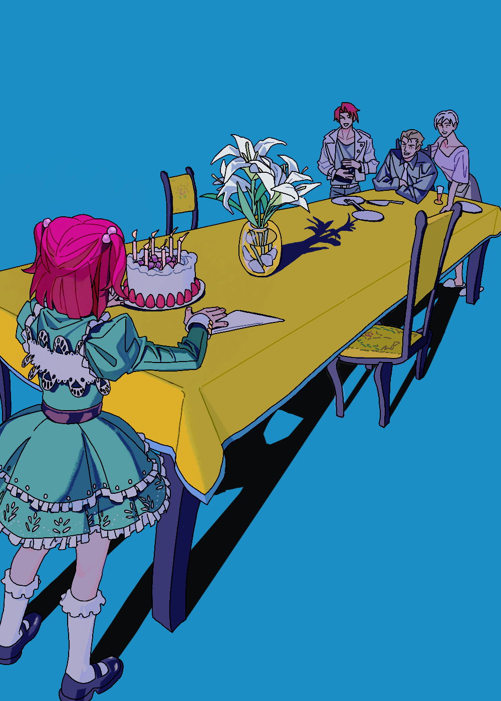 2boys 2girls becomeafish birthday birthday_cake blue_background brown_hair cake chair child closed_eyes crossed_arms dress family flower food fork frills hair_bobbles hair_ornament highres kneehighs knife lily_(flower) long_sleeves mary_janes multiple_boys multiple_girls plate puffy_long_sleeves puffy_sleeves red_hair shadow shoes short_hair short_sleeves simple_background slippers smile socks standing table two_side_up umineko_no_naku_koro_ni ushiromiya_ange ushiromiya_battler ushiromiya_kyrie ushiromiya_rudolf vase white_flower white_lily