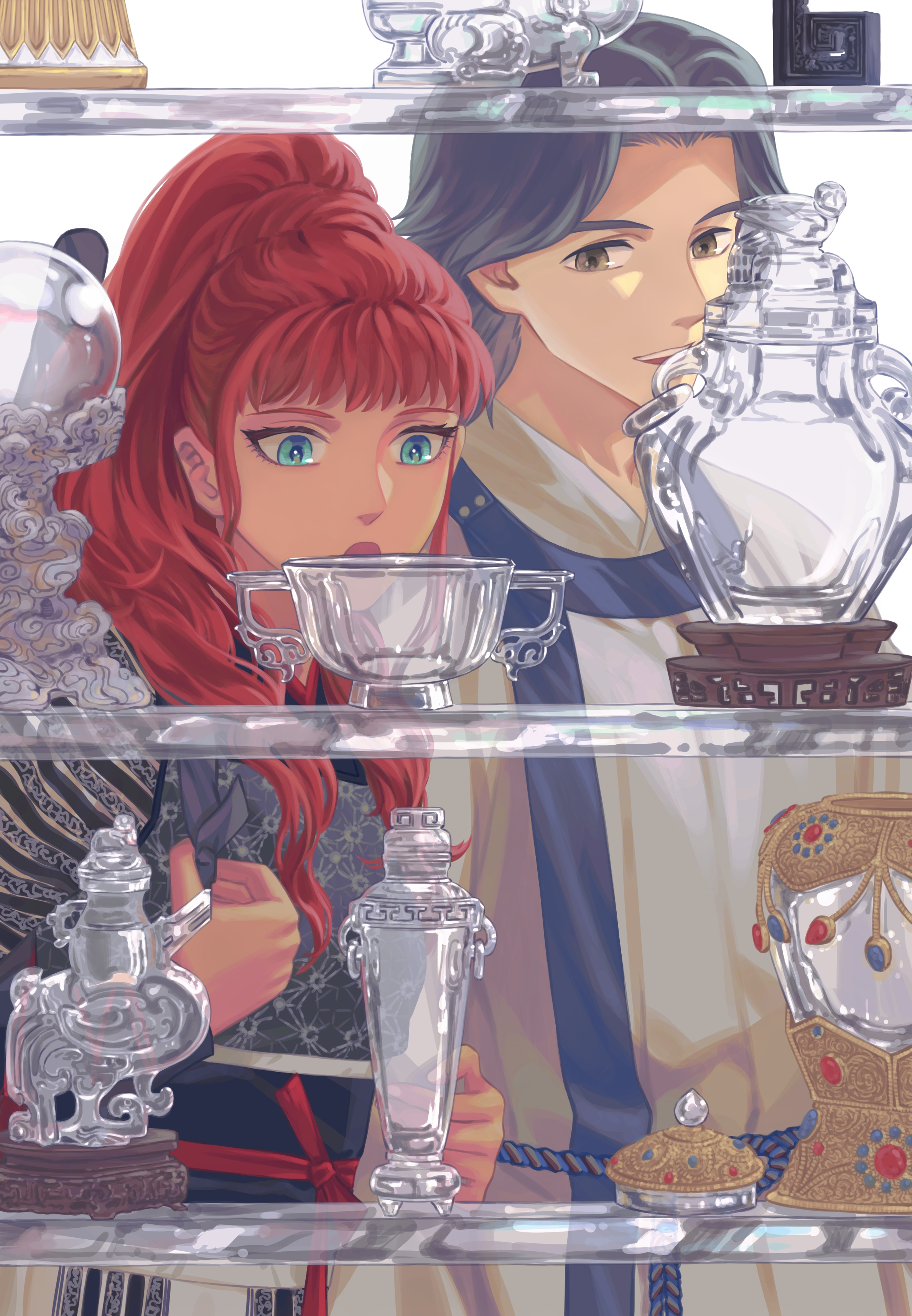 1boy 1girl absurdres black_hair blue_eyes blunt_bangs brown_eyes chinese_clothes glass_bottle hair_over_shoulder highres juuni_kokuki lid long_hair long_sleeves nakajima_youko open_mouth orb parted_bangs ponytail rakushun_(juuni_kokuki) red_hair shelf shopping short_hair staring upper_body urn vase very_long_hair yi_(199702090505)