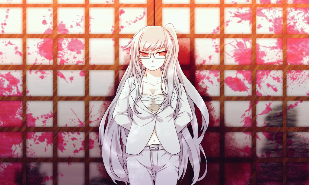 1girl alternate_costume alternate_hairstyle belt blood breasts chest_sarashi cleavage collarbone danganronpa_(series) danganronpa_2:_goodbye_despair danganronpa_3_(anime) formal_clothes glasses hands_in_pockets jacket long_hair medium_breasts midriff official_alternate_costume official_alternate_hairstyle pants pekoyama_peko red_eyes sarashi solo suit upper_body white_belt white_hair white_jacket white_pants white_suit zi_huahuo