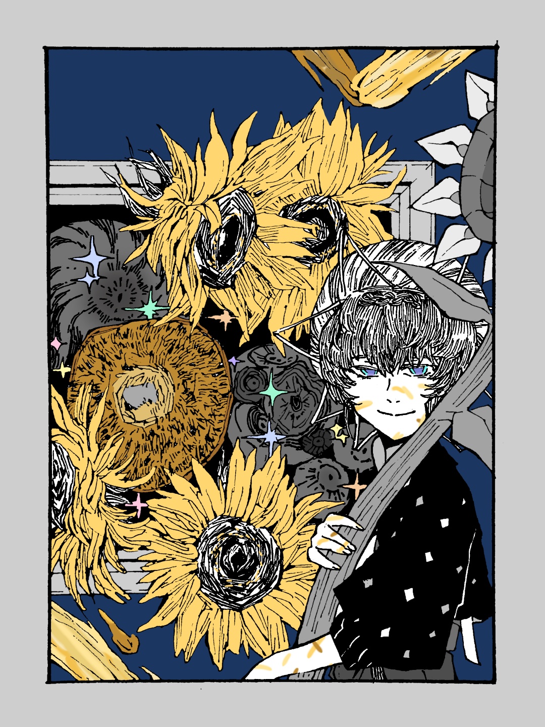 1girl blue_eyes capelet closed_mouth fate/grand_order fate_(series) flower hat highres holding holding_flower looking_at_viewer medium_hair oversized_flower paint_splatter paint_splatter_on_face partially_colored picture_frame sawbeaver smile solo sunflower upper_body van_gogh_(fate) van_gogh_(first_ascension)_(fate)