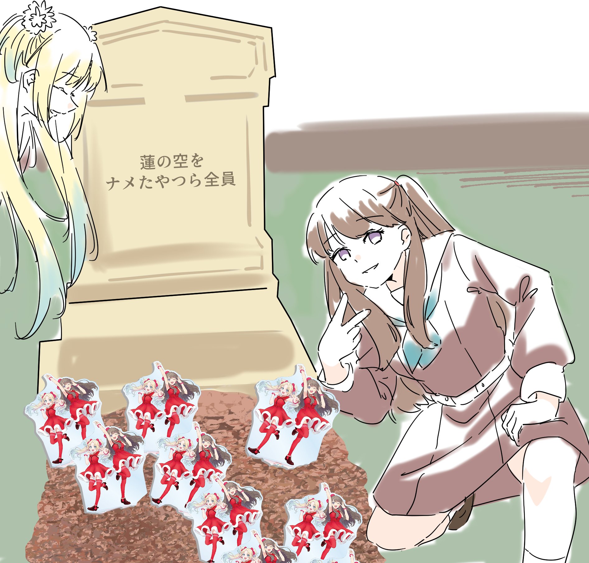 2girls blonde_hair blue_neckerchief brown_dress brown_hair closed_eyes dress flower fujishima_megumi grant_gustin_next_to_oliver_queen's_grave_(meme) hair_flower hair_ornament hasu_no_sora_school_uniform highres link!_like!_love_live! long_sleeves looking_at_viewer love_live! meme mira-cra_park! multiple_girls musihara neckerchief osawa_rurino purple_eyes sailor_collar school_uniform sidelocks sketch smile squatting tombstone upper_body v white_sailor_collar winter_uniform