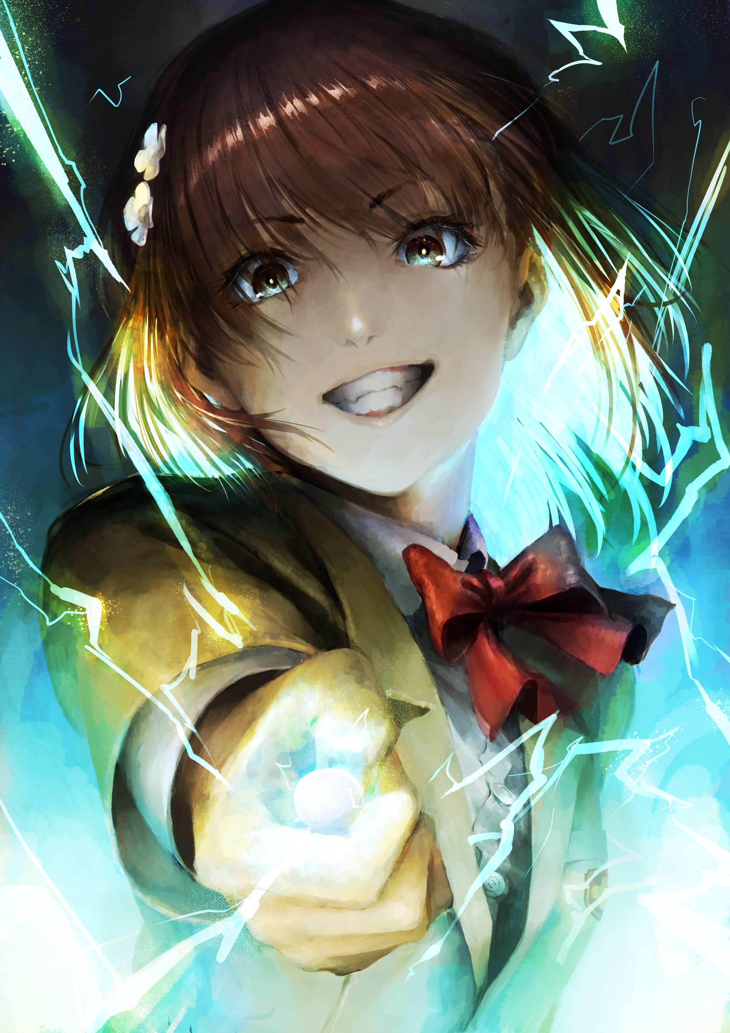 1girl absurdres blazer bow bowtie brown_eyes brown_hair brown_jacket coin collared_shirt doya_(doya_oekaki) electricity electrokinesis flower hair_flower hair_ornament highres impending_doom jacket long_sleeves looking_at_viewer medium_hair misaka_mikoto red_bow red_bowtie school_uniform shirt smile solo teeth toaru_kagaku_no_railgun toaru_majutsu_no_index tokiwadai_school_uniform white_shirt winter_uniform