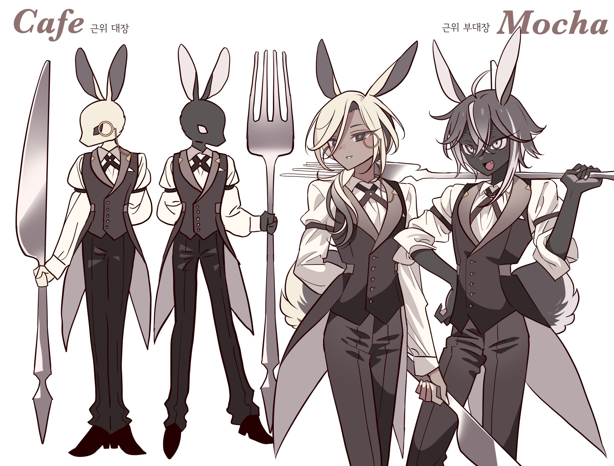 2boys animal_ears arm_behind_back black_fur black_hair black_necktie black_pants butler cafe_(sugar_bunny_recipe) character_name coattails collared_shirt dark-skinned_male dark_skin fork formal_clothes full_body furry furry_male hand_on_own_hip hand_up highres holding holding_fork holding_knife knife long_hair long_sleeves looking_at_viewer low_ponytail male_focus meremero mocha_(sugar_bunny_recipe) monocle multicolored_hair multiple_boys necktie open_mouth oversized_object pants ponytail rabbit_boy rabbit_ears rabbit_tail shirt smile standing streaked_hair sugar_bunny_recipe suit tail tailcoat white_fur white_hair white_shirt