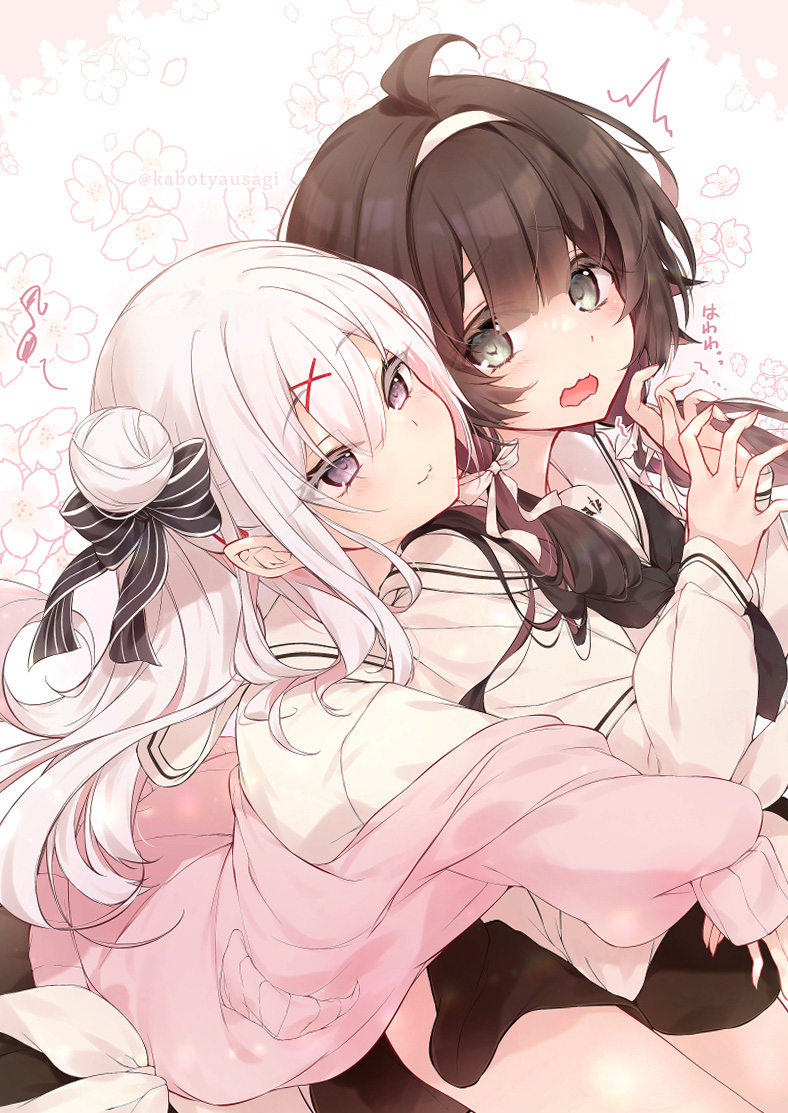 2girls ^^^ ahoge black_bow black_neckerchief black_skirt bow brown_hair closed_mouth commentary_request eighth_note floral_background grey_eyes hair_between_eyes hair_bow hair_bun hair_ornament hairband hug hug_from_behind jacket kabocha_usagi long_sleeves multiple_girls musical_note neckerchief novel_illustration off_shoulder official_art open_clothes open_jacket open_mouth original pink_jacket puffy_long_sleeves puffy_sleeves purple_eyes sailor_collar shirt simple_background single_side_bun skirt sleeves_past_wrists smile striped_bow translation_request trembling twitter_username white_background white_hair white_hairband white_sailor_collar white_shirt x_hair_ornament