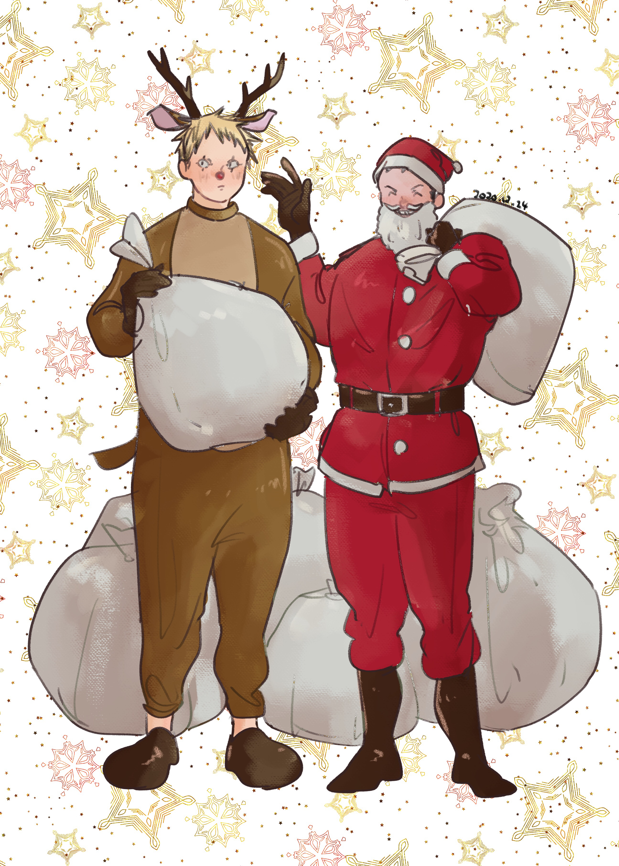 2boys absurdres aikawa_(dorohedoro) alternate_costume animal_costume animal_ears antlers black_hair blonde_hair christmas colored_tips couple deer_ears dorohedoro facial_mark fake_beard fake_facial_hair full_body hat highres horns looking_at_viewer male_focus medium_sideburns multicolored_hair multiple_boys nishida_(pixiv_50671594) no_eyebrows red_nose reindeer_antlers reindeer_costume risu_(dorohedoro) sack santa_costume santa_hat sideburns standing thick_eyebrows waving yaoi