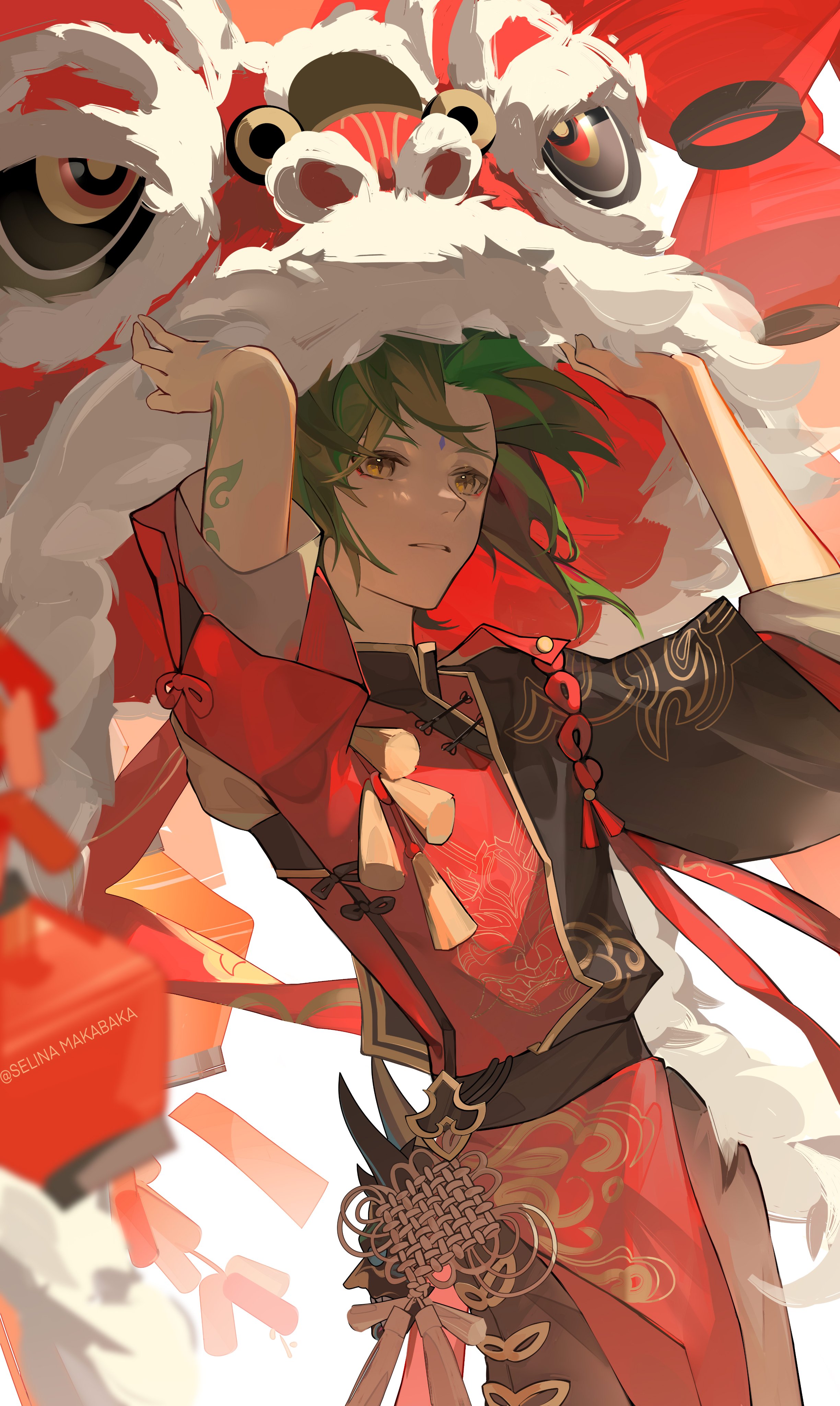 1boy absurdres alternate_costume bishounen chinese_clothes cowboy_shot genshin_impact green_hair hand_up highres lion_dance male_focus selina_makabaka short_hair simple_background smile solo white_background xiao_(genshin_impact) yellow_eyes