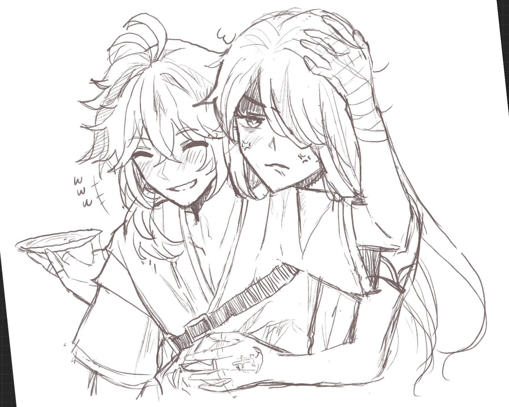 1boy 1girl ahoge anger_vein bandaged_arm bandages beidou_(genshin_impact) blush closed_mouth cup genshin_impact hair_over_one_eye headpat highres hug japanese_clothes kaedehara_kazuha kasep long_hair monochrome sakazuki short_hair sketch smile upper_body