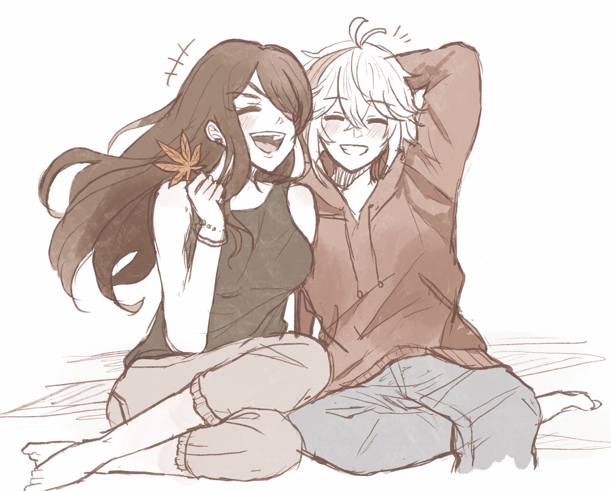 1boy 1girl ahoge alternate_costume beidou_(genshin_impact) black_shirt brown_hair closed_eyes couple flower full_body genshin_impact hand_up hetero highres kaedehara_kazuha kasep multicolored_hair open_mouth red_hair red_shirt shirt short_hair sitting smile streaked_hair white_hair