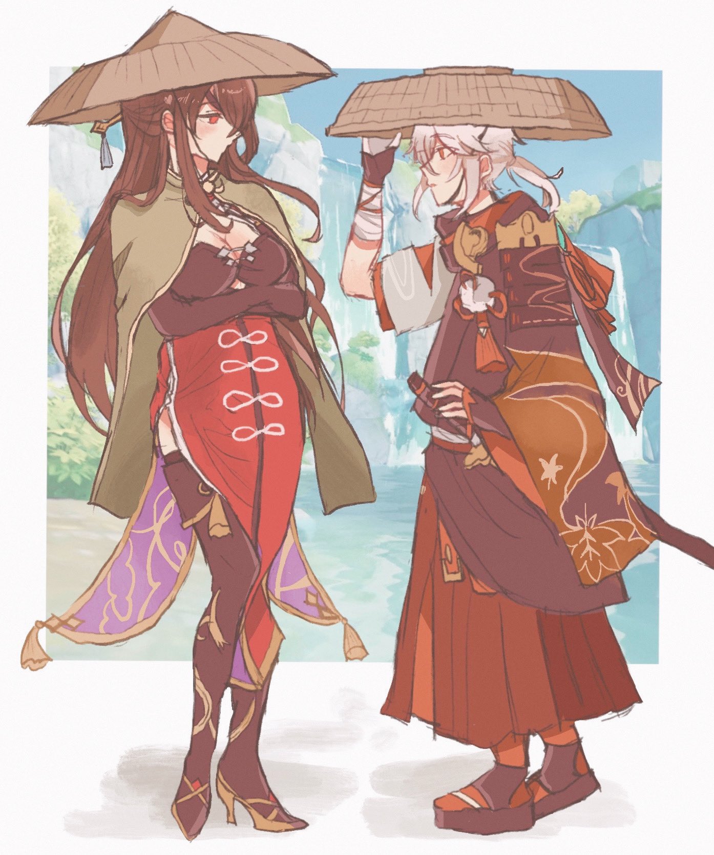 1boy 1girl beidou_(genshin_impact) brown_hair cape couple from_side full_body genshin_impact hand_up hat hetero highres japanese_clothes kaedehara_kazuha kasep katana long_hair ponytail red_eyes shoes short_hair sword weapon white_hair