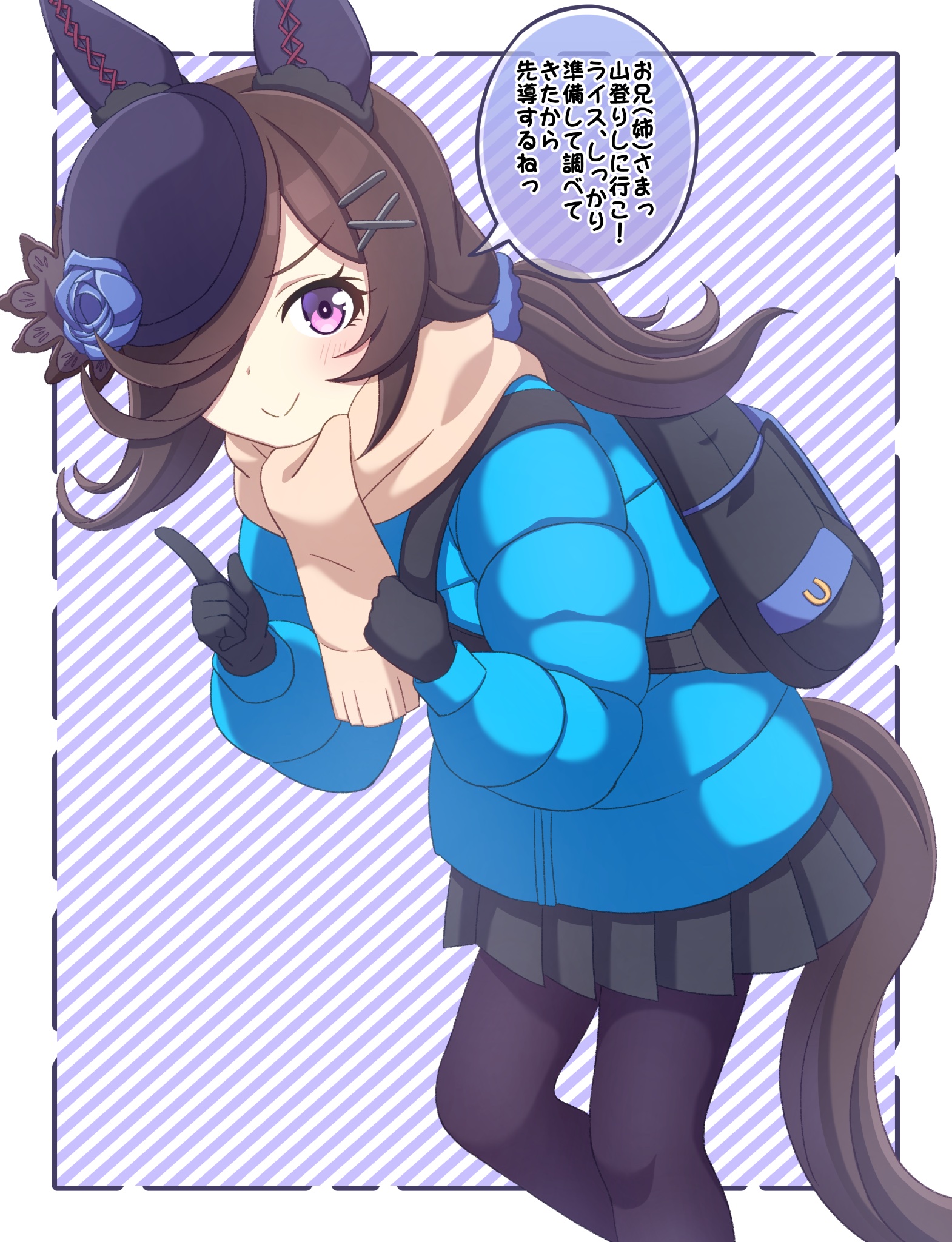 1girl animal_ears backpack bag black_bag black_gloves black_skirt blue_bag blue_coat blue_flower blue_rose blue_scrunchie blush border brown_scarf closed_mouth coat commentary ear_covers fascinator flower gloves hair_over_one_eye hat hat_flower highres horse_ears horse_girl horse_tail index_finger_raised katsushika_yuki leggings long_hair looking_at_viewer parka pleated_skirt ponytail purple_background purple_headwear purple_leggings rice_shower_(umamusume) rose scarf scrunchie skirt smile striped_background tail tilted_headwear translated two-tone_bag umamusume white_border winter_clothes