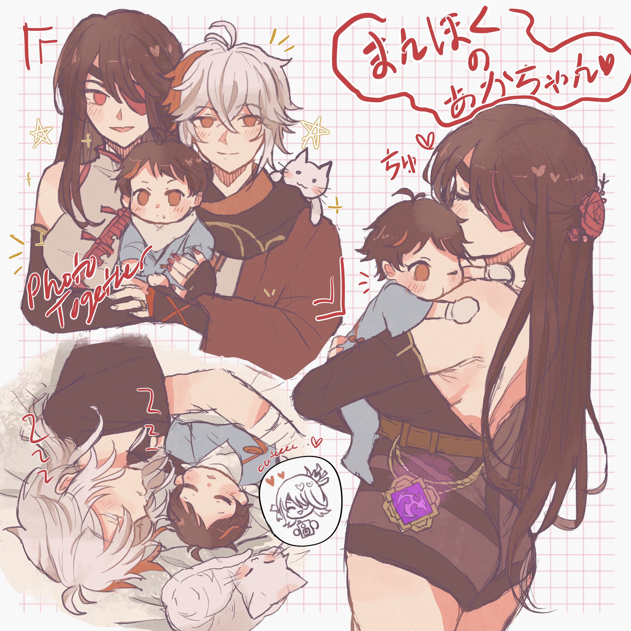 1girl 2boys ahoge beidou_(genshin_impact) brown_hair cat closed_eyes couple eyepatch genshin_impact heart hetero highres if_they_mated kaedehara_kazuha kasep long_hair multicolored_hair multiple_boys red_eyes red_hair short_hair sleeping smile streaked_hair vision_(genshin_impact) white_cat white_hair zzz