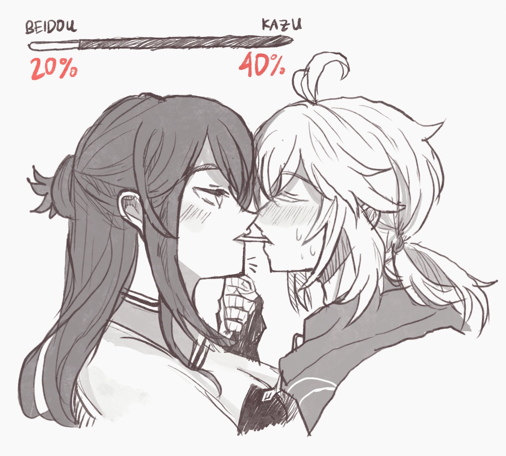 1boy 1girl ahoge beidou_(genshin_impact) brown_hair character_name closed_eyes couple food food_in_mouth from_side genshin_impact hetero highres incoming_pocky_kiss kaedehara_kazuha kasep long_hair pocky pocky_in_mouth pocky_kiss shared_food short_hair simple_background upper_body white_background white_hair