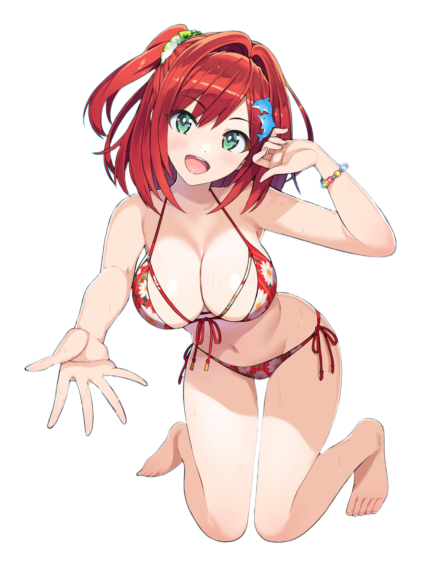 1girl :d armpit_crease bare_arms bare_shoulders barefoot bikini blush bracelet breasts bright_pupils cleavage clenched_hands collarbone commentary_request dolphin_hair_ornament dolphin_wave floral_print floral_print_bikini front-tie_bikini_top front-tie_top full_body gradient_background green_background green_eyes green_scrunchie hair_between_eyes hair_intakes hair_ornament hair_scrunchie hairclip hands_up highres jewelry large_breasts looking_at_viewer multicolored_background navel official_art one_side_up ootomo_takuji open_mouth pink_background print_bikini red_bikini sakimiya_iruka scrunchie short_hair side-tie_bikini_bottom smile solo standing stomach swimsuit w_arms white_pupils yellow_background