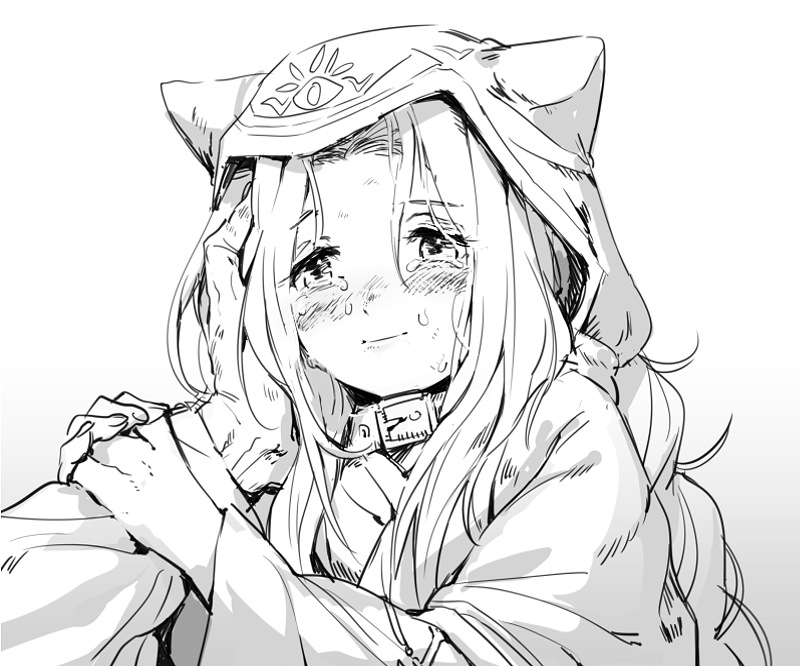 1girl 1other animal_ear_hood animal_ears blush character_request cloak closed_mouth collar crying crying_with_eyes_open dashi_(minzoku_gb) fake_animal_ears fate/grand_order fate_(series) greyscale hand_on_another's_arm hand_on_another's_cheek hand_on_another's_face hood hood_up hooded_cloak long_hair long_sleeves looking_afar looking_at_another medusa_(fate) medusa_(lancer)_(fate) monochrome out_of_frame parted_bangs rider simple_background smile solo_focus tears upper_body white_background
