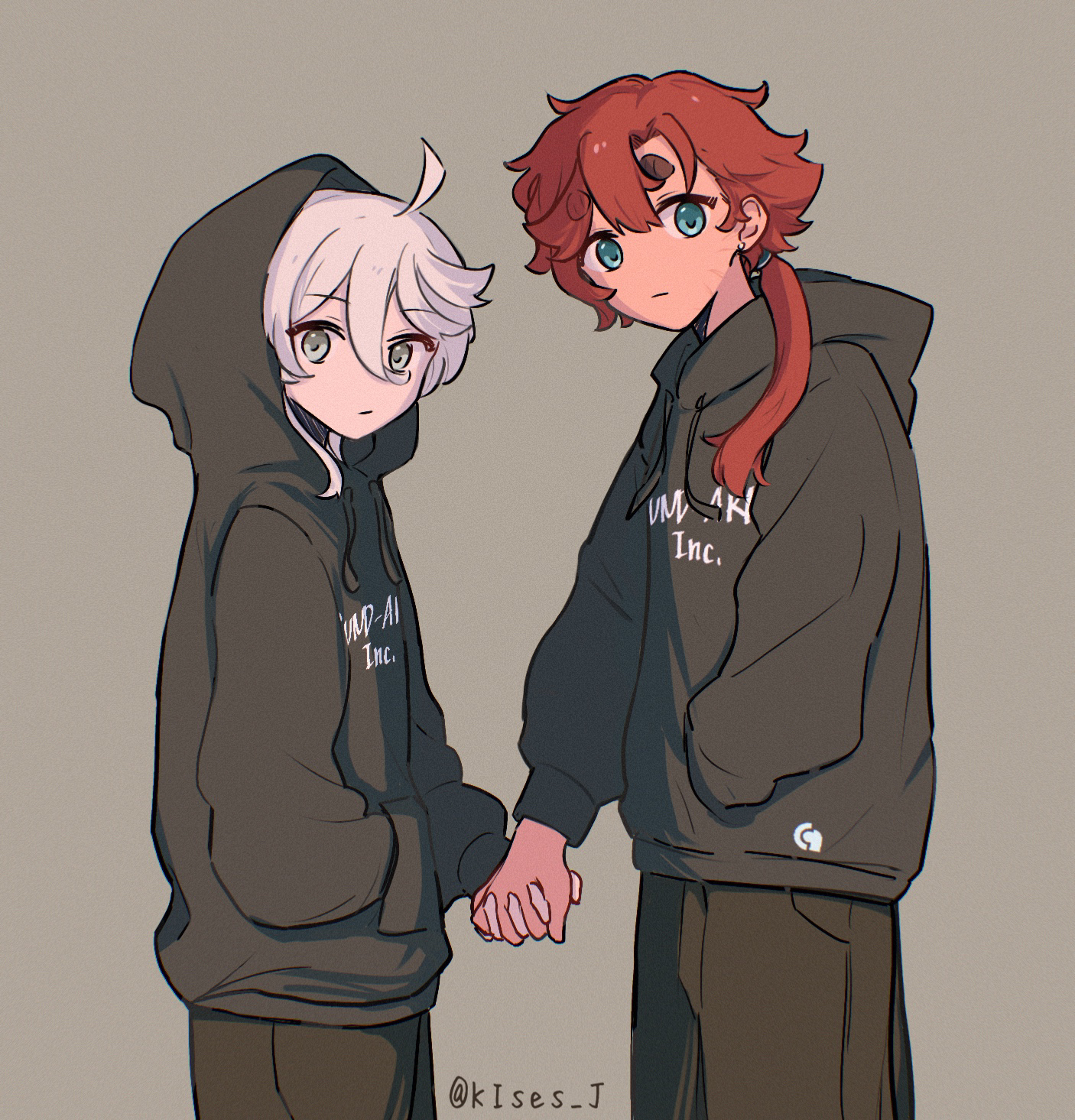 2girls ahoge black_hoodie black_pants blue_eyes commentary_request contemporary grey_background grey_eyes gundam gundam_suisei_no_majo highres holding_hands hood hood_down hood_up hoodie interlocked_fingers long_hair long_sleeves looking_at_viewer masaru_(kises_j) miorine_rembran multiple_girls pants ponytail sally_(ayaki_blade) simple_background suletta_mercury thick_eyebrows twitter_username white_hair yuri
