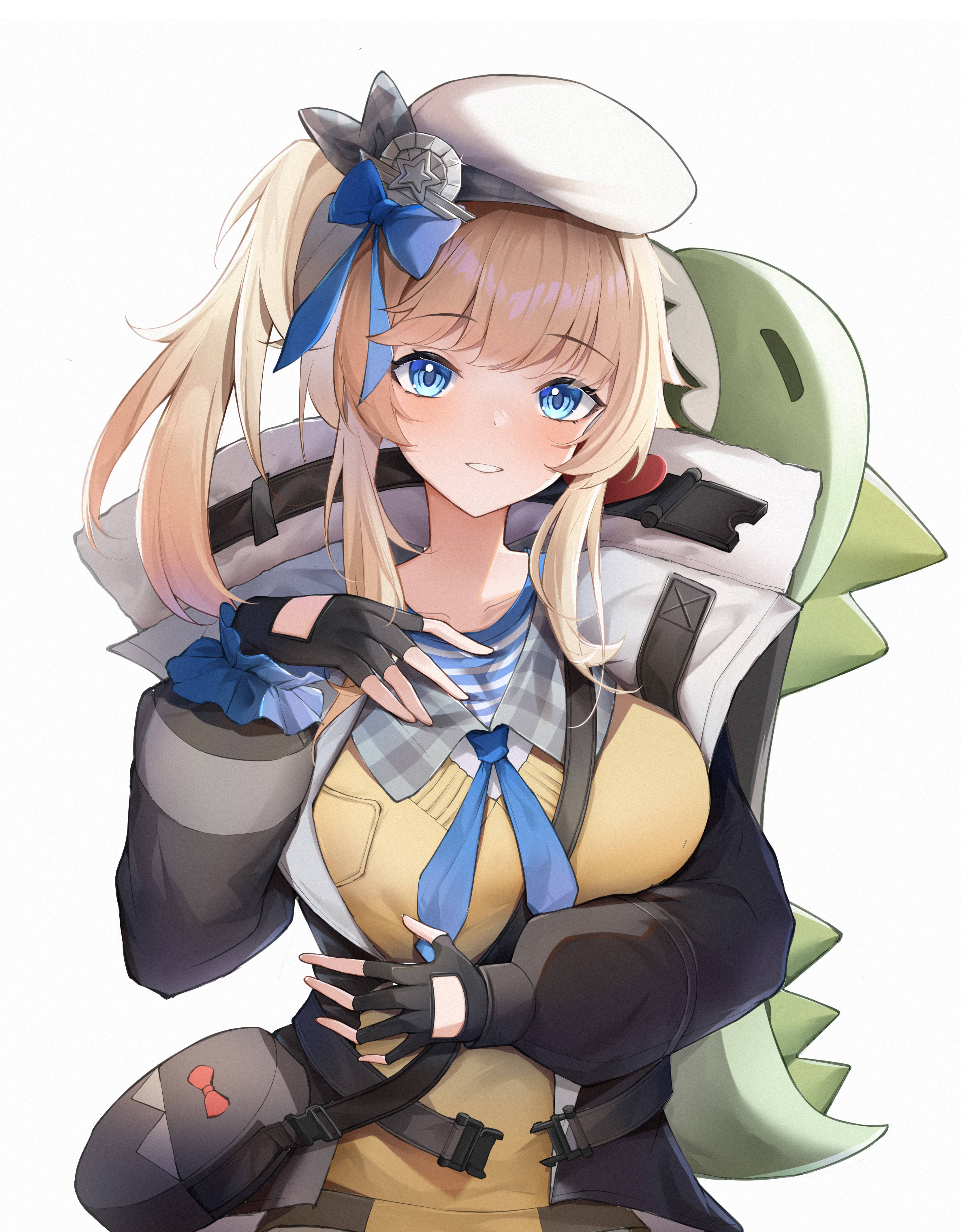 1girl absurdres animal_bag backpack bag beret black_gloves black_jacket blonde_hair blue_bow blue_eyes blue_ribbon bow breasts cardigan fingerless_gloves girls'_frontline girls'_frontline_2:_exilium gloves hair_bow hat highres jacket long_hair medium_breasts ribbon shoulder_bag sidelocks solo upper_body vepley_(girls'_frontline_2) wan3051 white_background white_hat yellow_cardigan