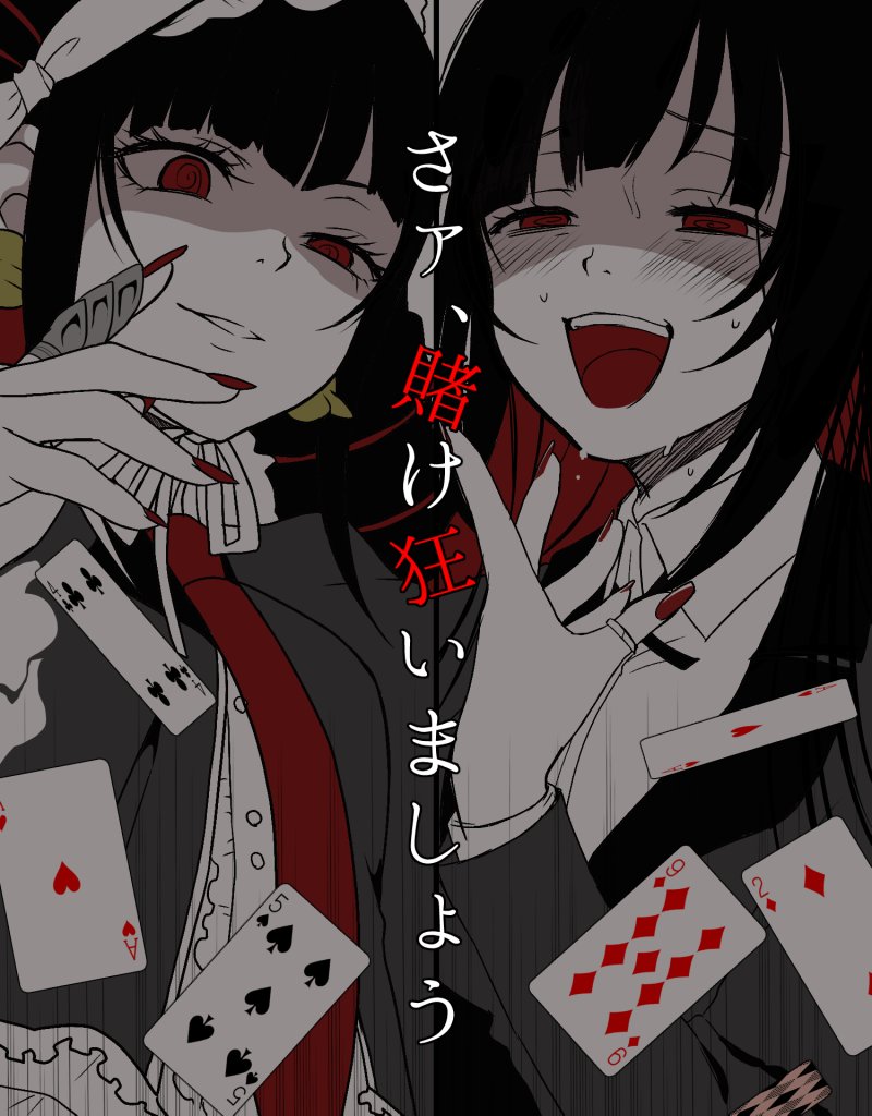 2girls :d black_hair black_nails bonnet card celestia_ludenberg claw_ring cowboy_shot crossover danganronpa:_trigger_happy_havoc danganronpa_(series) earrings frilled_jacket frills gothic_lolita hyakkaou_academy_school_uniform iberico jabami_yumeko jacket jewelry kakegurui lolita_fashion multiple_girls necktie open_mouth playing_card red_eyes red_necktie school_uniform smile