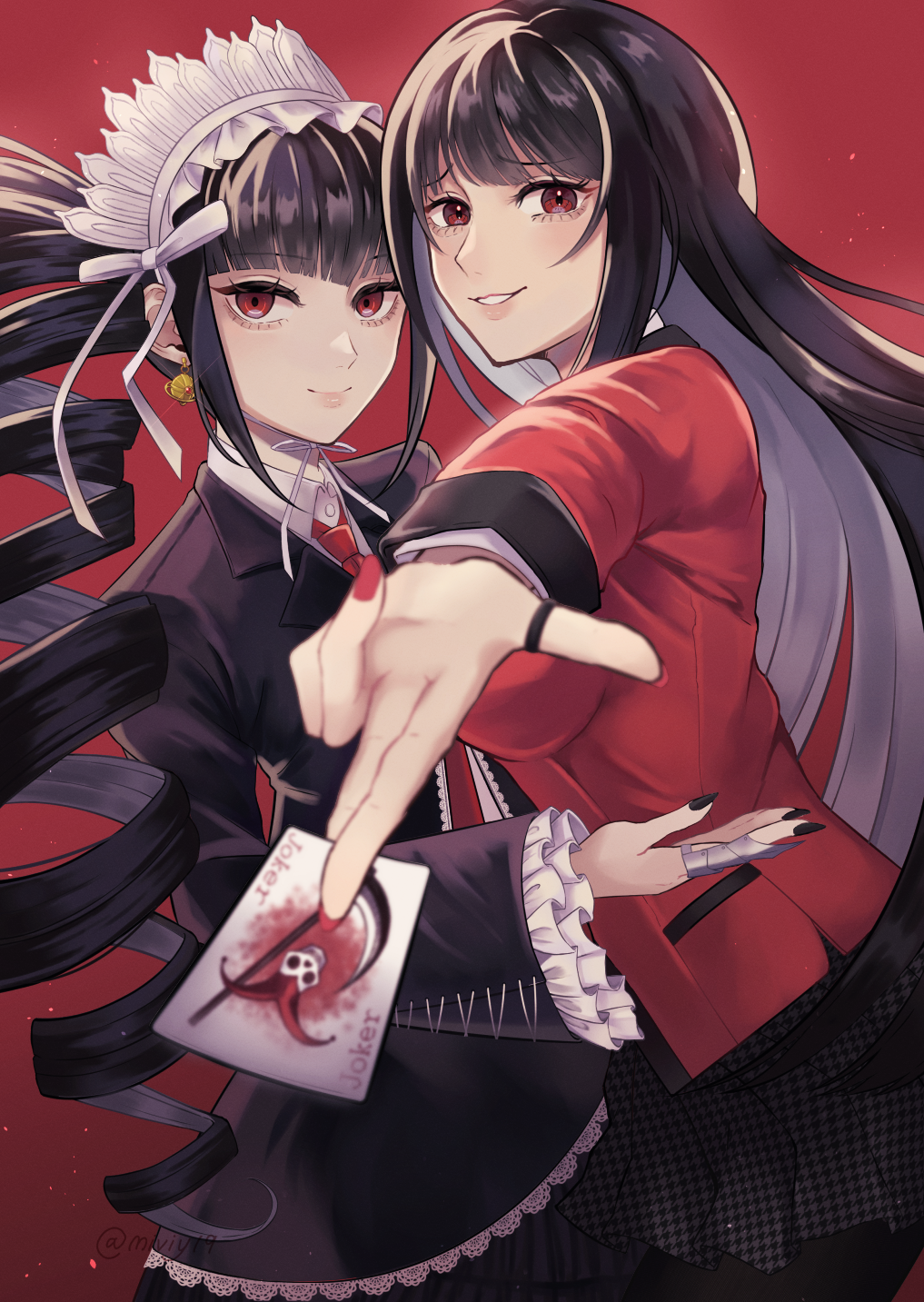 2girls aegyo_sal black_hair black_nails bonnet celestia_ludenberg claw_ring crossover danganronpa:_trigger_happy_havoc danganronpa_(series) drill_hair earrings frilled_jacket frills gothic_lolita highres hyakkaou_academy_school_uniform jabami_yumeko jacket jewelry kakegurui lolita_fashion miviy19 multiple_girls necktie red_background red_eyes red_nails red_necktie school_uniform skirt twin_drills twintails upper_body