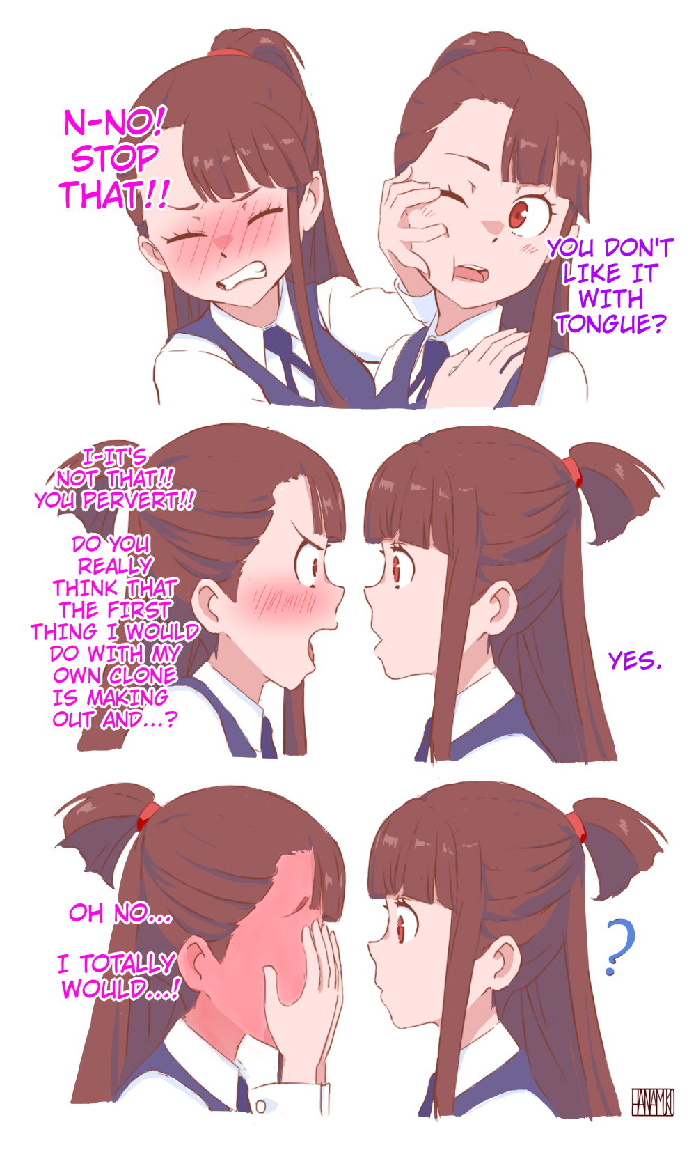2girls ? blush brown_hair english_text eye_contact full-face_blush hanamuko highres kagari_atsuko little_witch_academia long_hair looking_at_another multiple_girls red_eyes selfcest watermark yuri