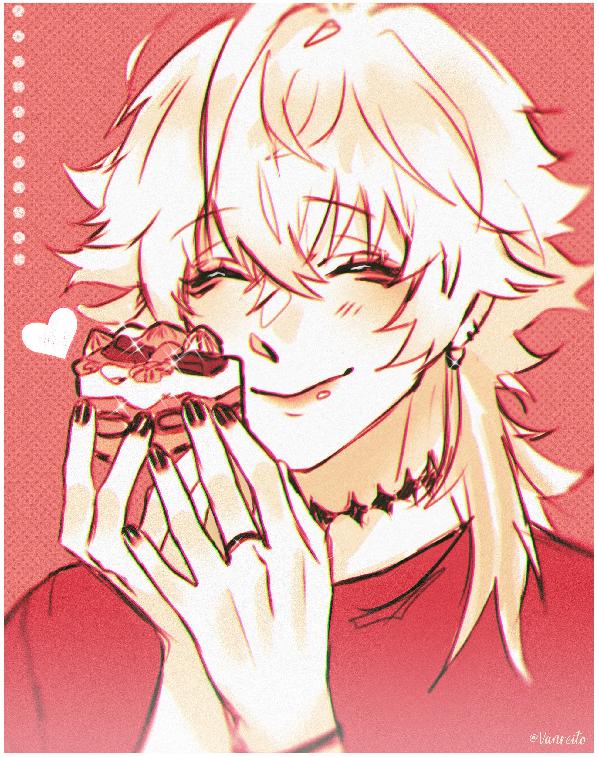1boy absurdres bishounen black_nails closed_eyes commentary diamond_choker earrings english_commentary eyeshadow gavis_bettel hair_between_eyes happy heart highres holostars holostars_english jewelry lipgloss makeup male_focus pink_background portrait ring smile solo tiramisu twitter_username vanreito virtual_youtuber