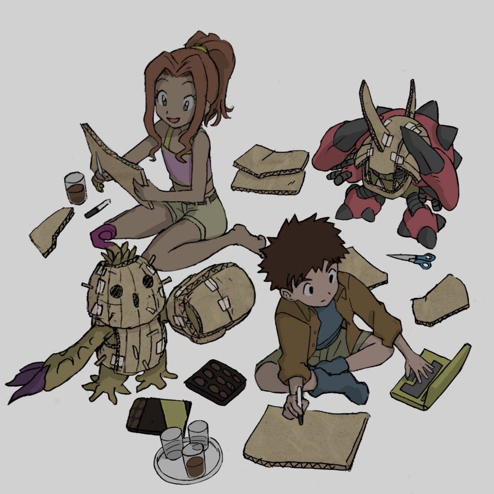 antennae black_eyes brown_eyes brown_hair bug claws cosplay digimon digimon_(creature) digimon_adventure digimon_adventure:_bokura_no_war_game exoskeleton flower izumi_koshiro kabuterimon kabuterimon_(cosplay) long_hair monster_girl palmon petals plant_girl sharp_teeth short_hair spikes tachikawa_mimi takeuchi_(rtakeuchi1535) teeth tentomon togemon togemon_(cosplay)