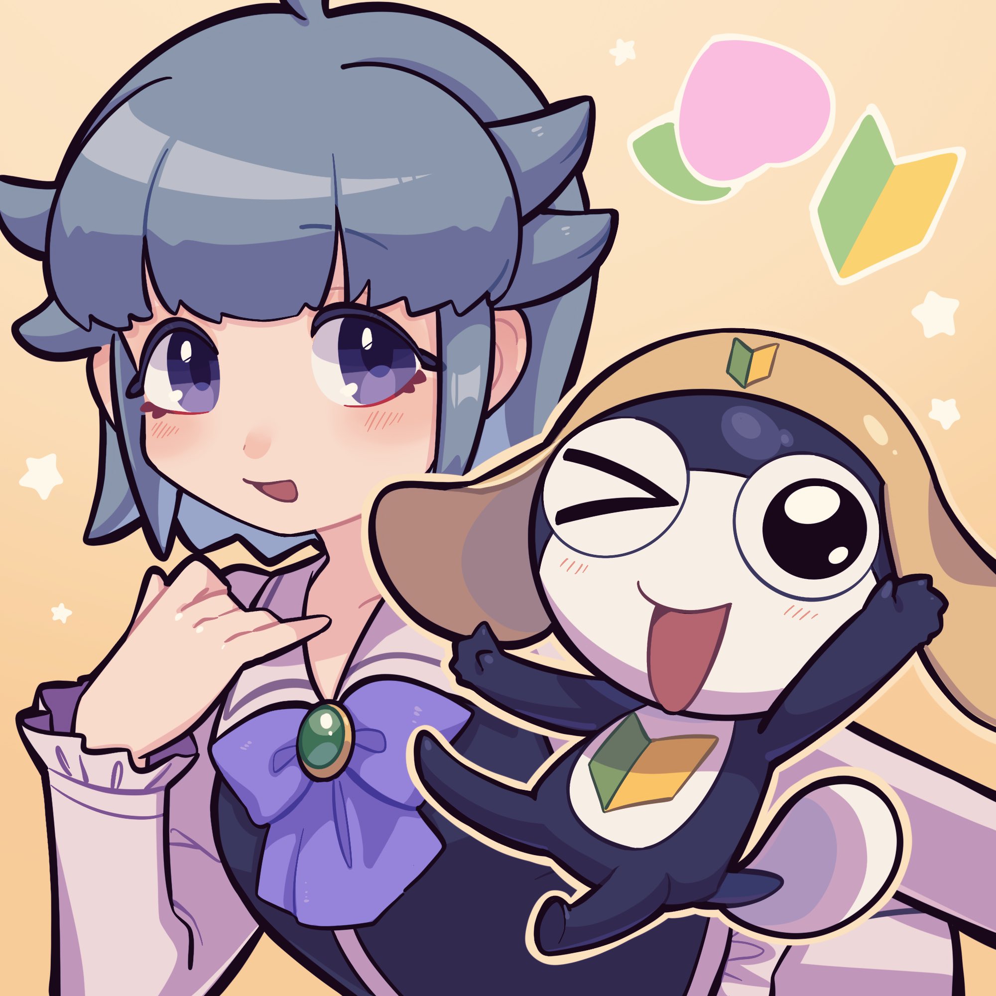 >_o 1boy 1girl an-chan_(ananna0315) collarbone grey_hair highres keroro_gunsou looking_at_viewer nishizawa_momoka one_eye_closed open_mouth purple_eyes short_hair shoshinsha_mark smile tamama