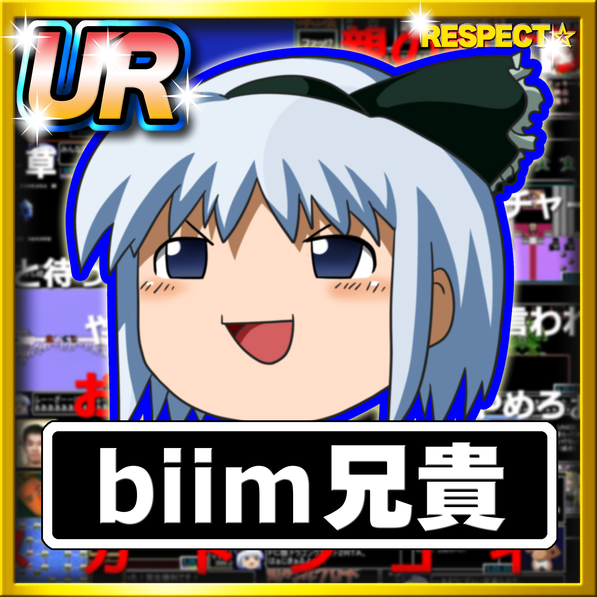 1girl biim_(cookie) black_hairband black_ribbon blush border card_(medium) card_parody character_name commentary_request cookie_(touhou) copyright_name full_body grey_eyes grey_hair hair_ribbon hairband highres juvei_quest konpaku_youmu meta_meta open_mouth ribbon short_hair smile solo sparkle star_(symbol) touhou v-shaped_eyebrows yellow_border yukkuri_shiteitte_ne