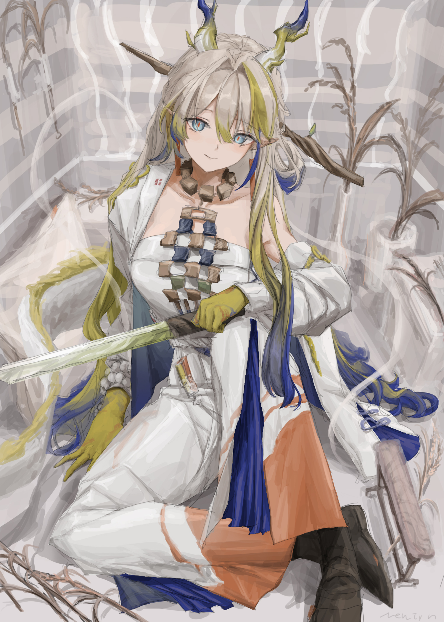 1girl arknights blue_eyes blue_hair brown_footwear colored_skin commentary dragon_girl dragon_horns green_hair hair_between_eyes hair_intakes highres horns jacket knee_up long_hair long_sleeves looking_at_viewer multicolored_hair new_t_y_n pants pointy_ears shirt shu_(arknights) single_bare_shoulder single_off_shoulder sitting solo strapless strapless_shirt white_hair white_jacket white_pants white_shirt