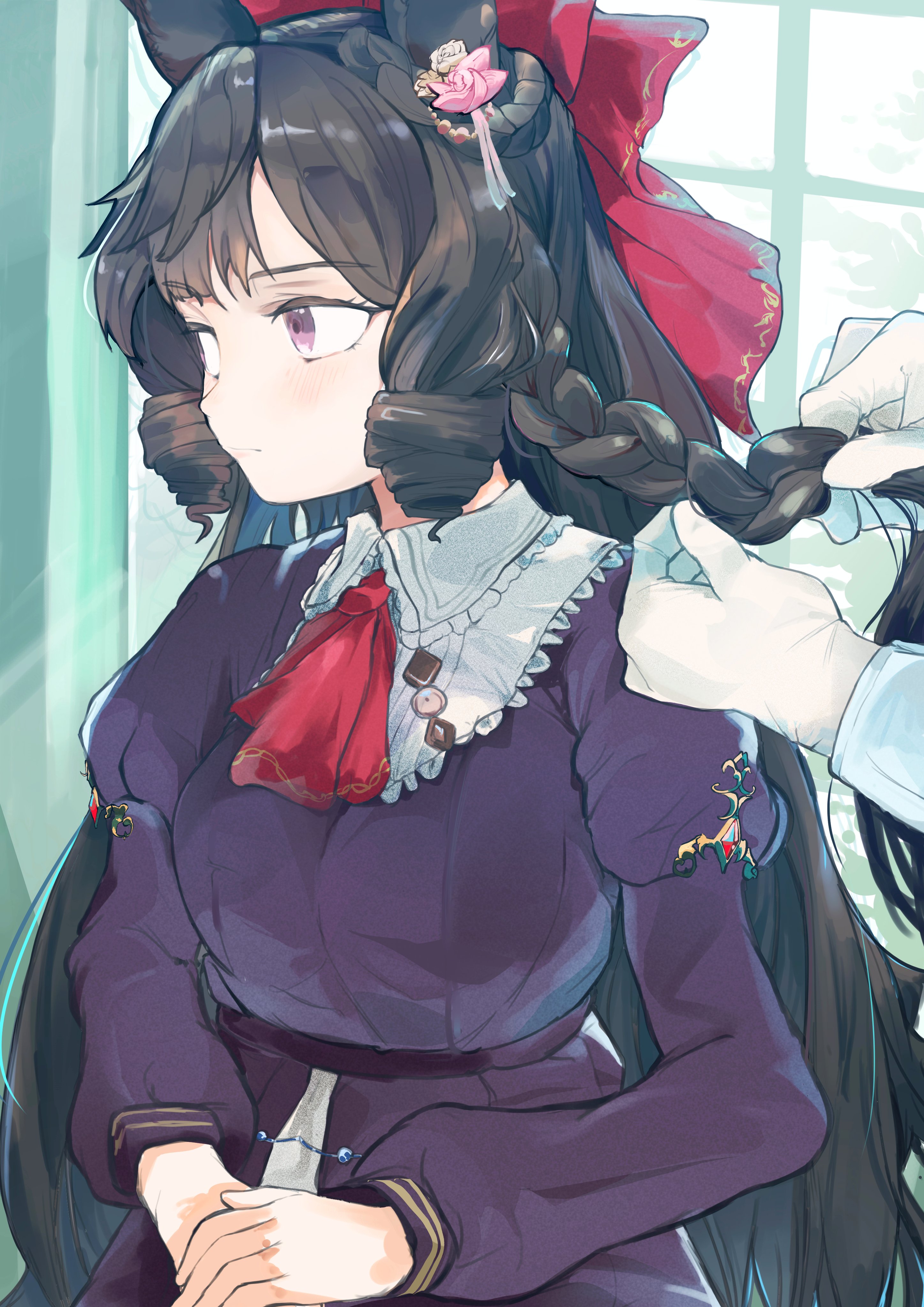 1girl 1other absurdres animal_ears ascot black_hair bow daiichi_ruby_(brilliant_red_gemstone)_(umamusume) daiichi_ruby_(umamusume) dress drill_hair fagrp12 flower hair_bow hair_flower hair_ornament highres horse_ears horse_girl long_hair long_sleeves looking_to_the_side purple_dress purple_eyes red_ascot red_bow solo_focus umamusume upper_body very_long_hair