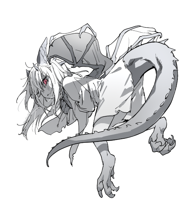 1girl animal_feet animal_hands child claws clothing_cutout digitigrade dragon_girl dragon_horns dragon_tail dragon_wings dress floating floating_hair full_body hair_over_one_eye hands_on_own_chest hands_up horns long_hair long_sleeves looking_at_viewer looking_back monster_girl mullmull02 multiple_horns original parted_lips pink_eyes simple_background slit_pupils solo spot_color tail tail_through_clothes white_background wings