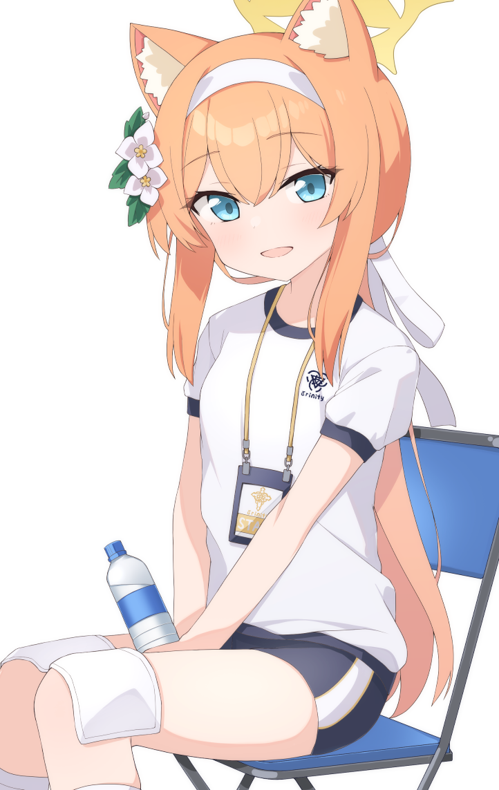 1girl :d animal_ear_fluff animal_ears between_legs black_shorts blue_archive blue_eyes bottle chair commentary_request feet_out_of_frame flower hair_between_eyes hair_flower hair_ornament hairband halo hand_between_legs long_hair looking_at_viewer low_ponytail mari_(blue_archive) mari_(track)_(blue_archive) on_chair open_mouth orange_hair ponytail puffy_short_sleeves puffy_sleeves rateratte shirt short_shorts short_sleeves shorts sidelocks simple_background sitting smile solo very_long_hair water_bottle white_background white_flower white_hairband white_shirt