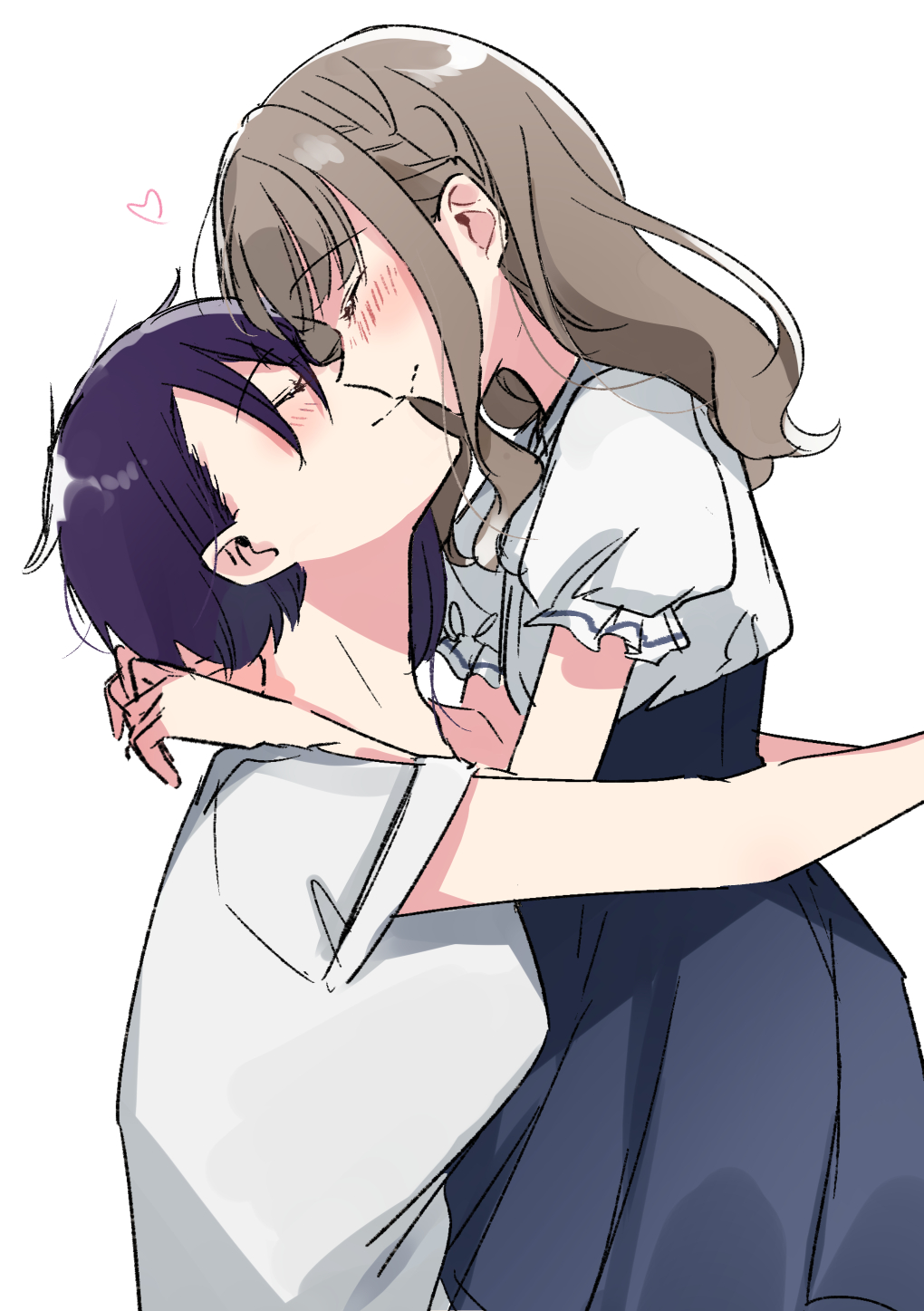 2girls ayukawa_hinami blue_skirt blush braid breasts brown_hair closed_eyes commentary_request couple face-to-face facing_another french_braid highres hiiragi_shiki ikemen_sugi_desu_shiki-senpai! long_hair medium_breasts multiple_girls partial_commentary puffy_short_sleeves puffy_sleeves purple_hair shirt short_hair short_sleeves sidelocks simple_background skirt small_breasts upper_body white_background white_shirt yuama yuri